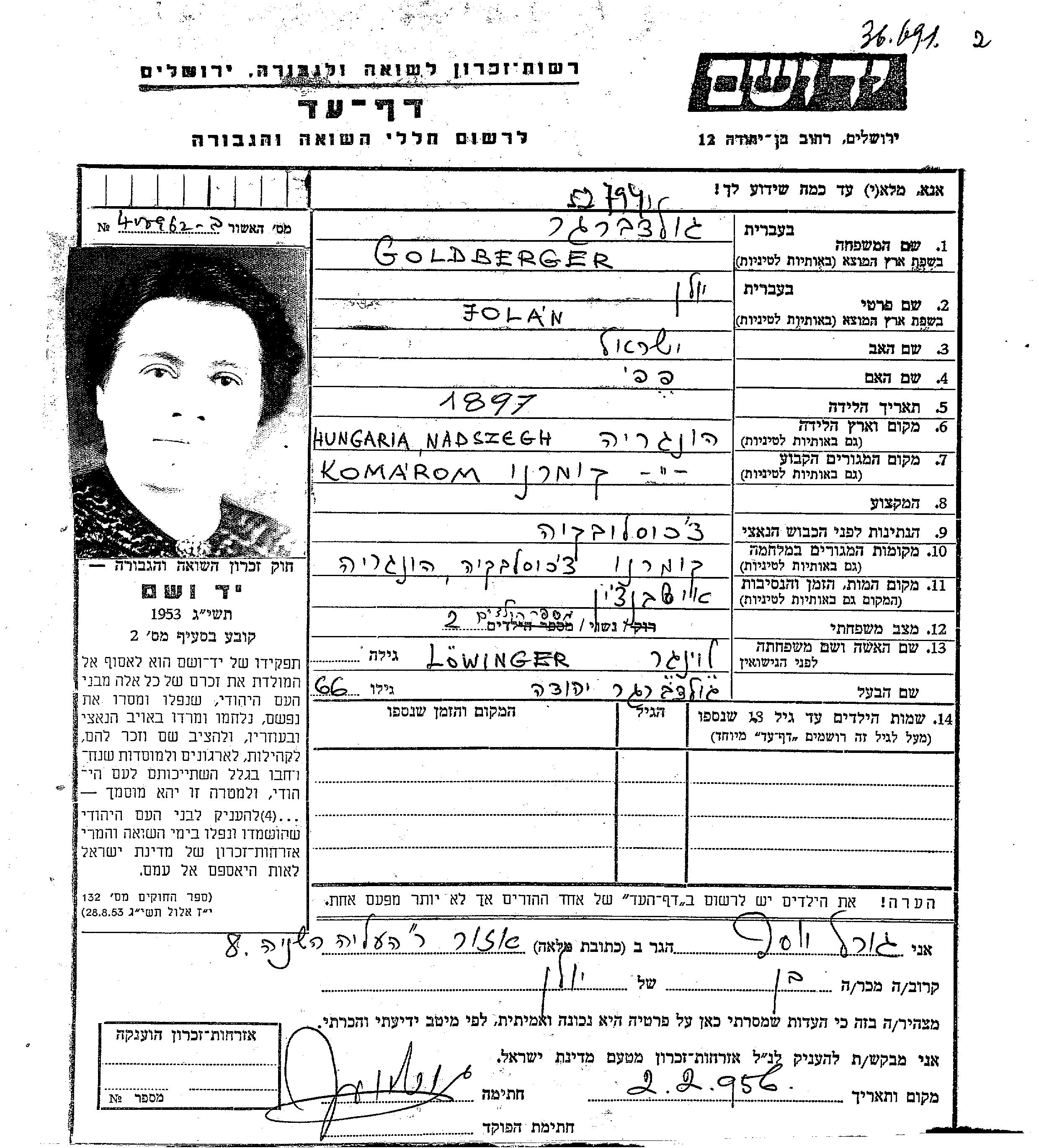 Jolan Goldberger née Lowinger est née à Nadseg, Tchécoslovaquie en 1897. Avant la seconde guerre mondiale elle vivait à Komarom, Hongrie.