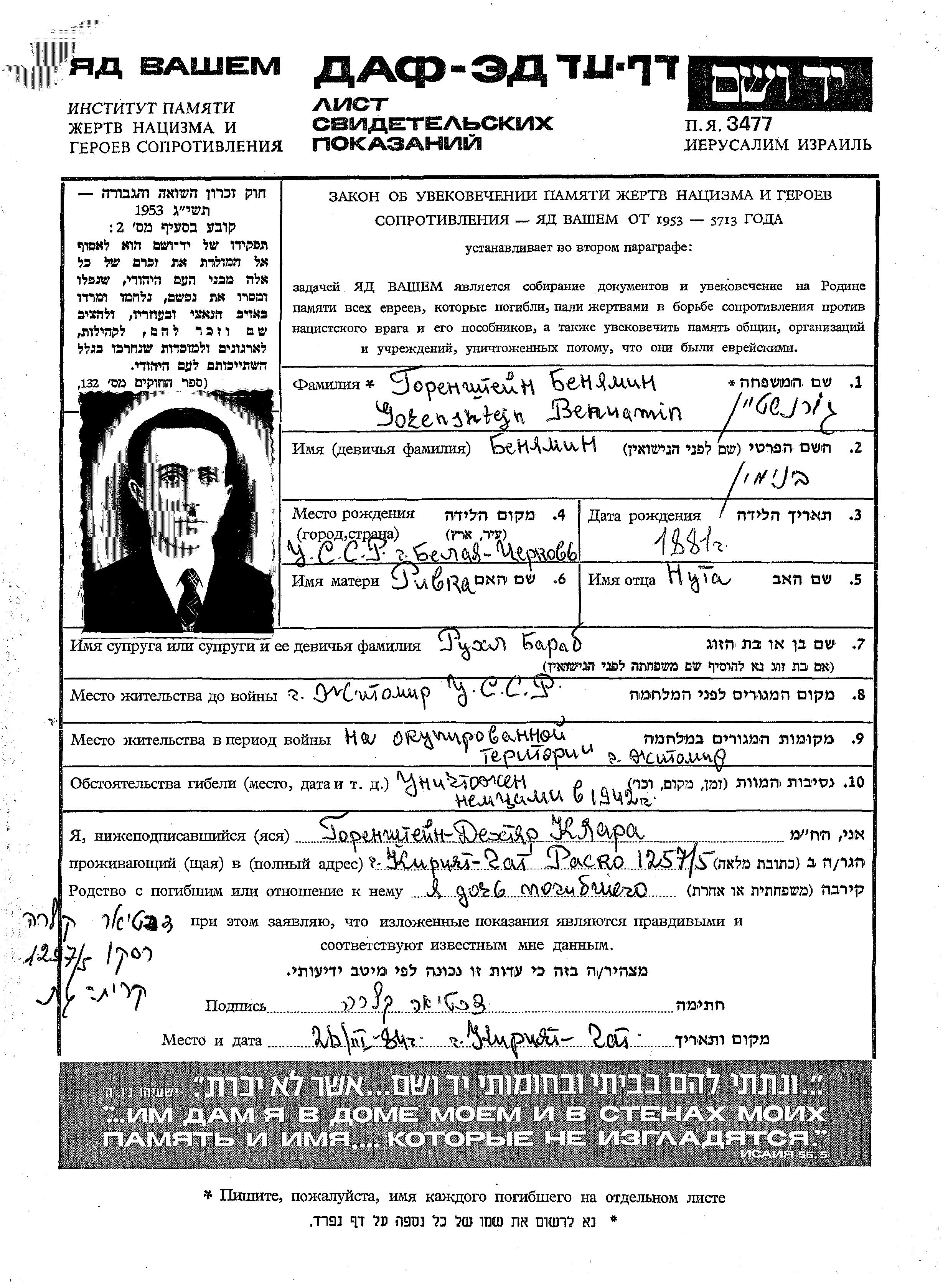 Gorenstein Beniamin 1881 Zhitomir, Ukraine (URSS) Feuille de témoignage