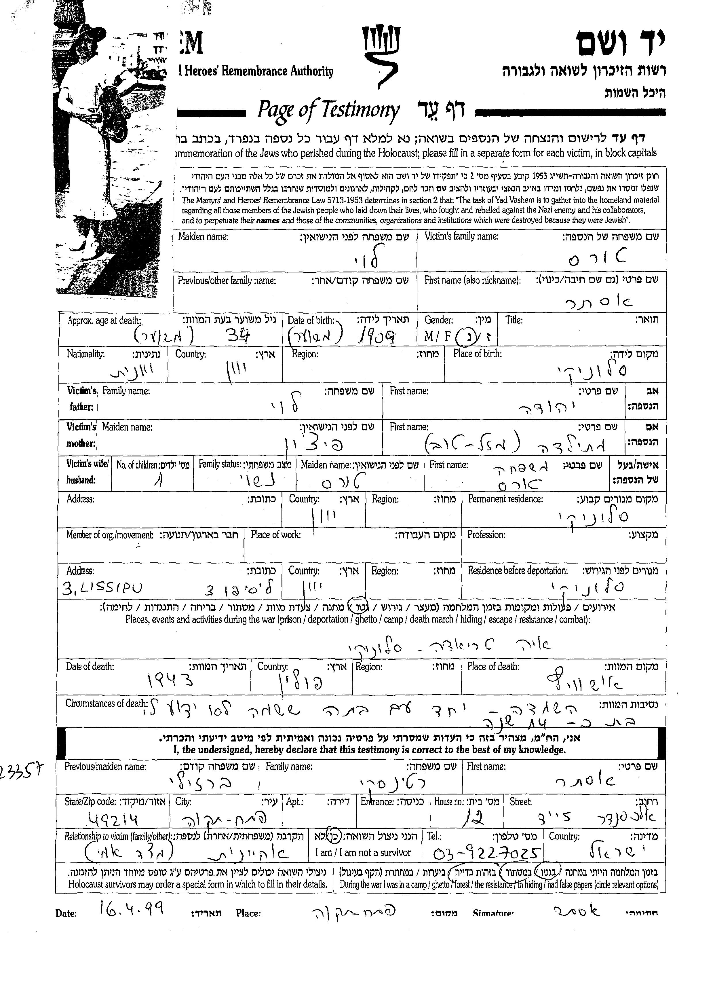Tores | prénom inconnu | Saloniki, Grèce | Feuille de témoignage | |