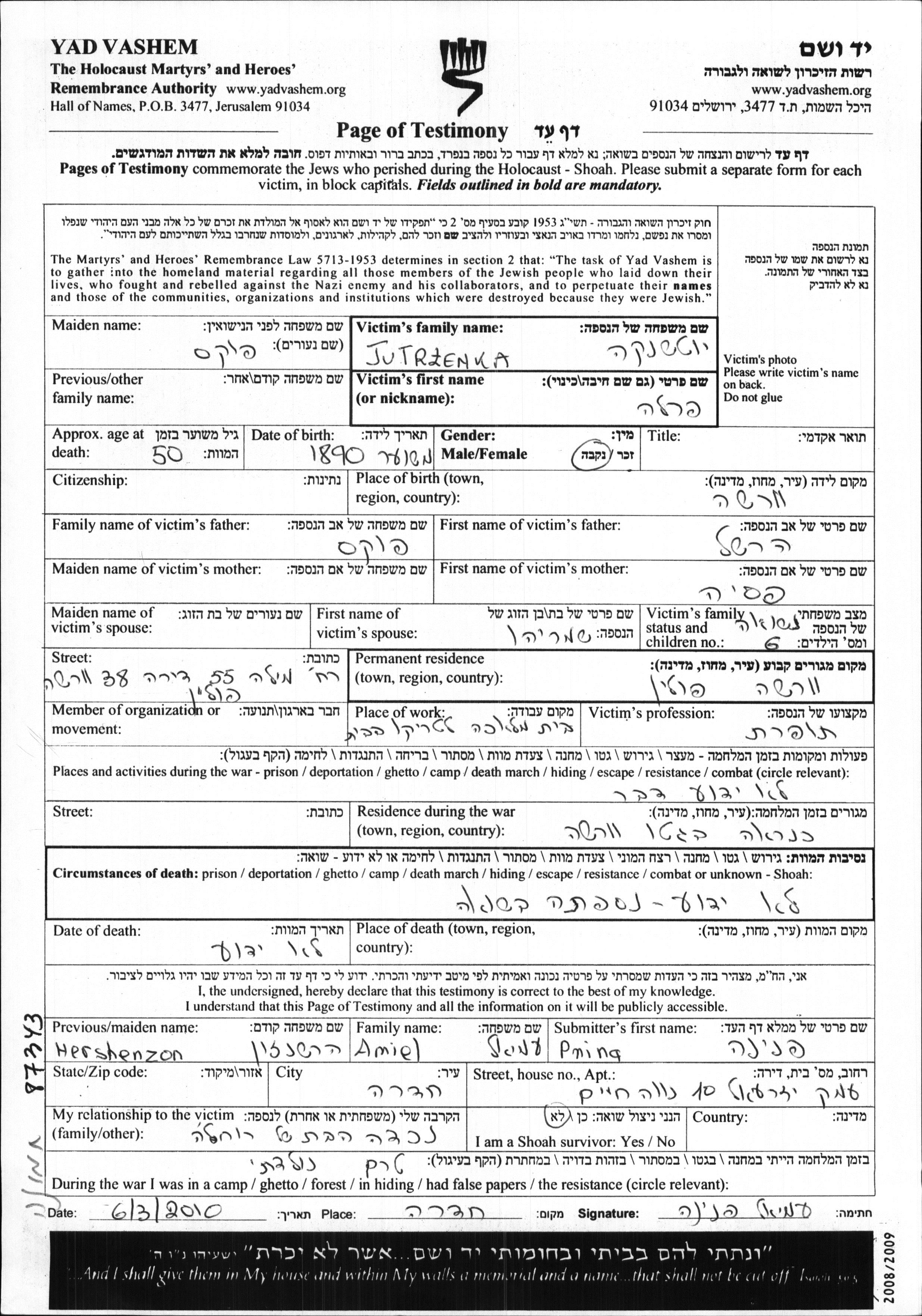 Jutrzenka | Perla | 1890 | Warszawa, Pologne | Feuille de témoignage |