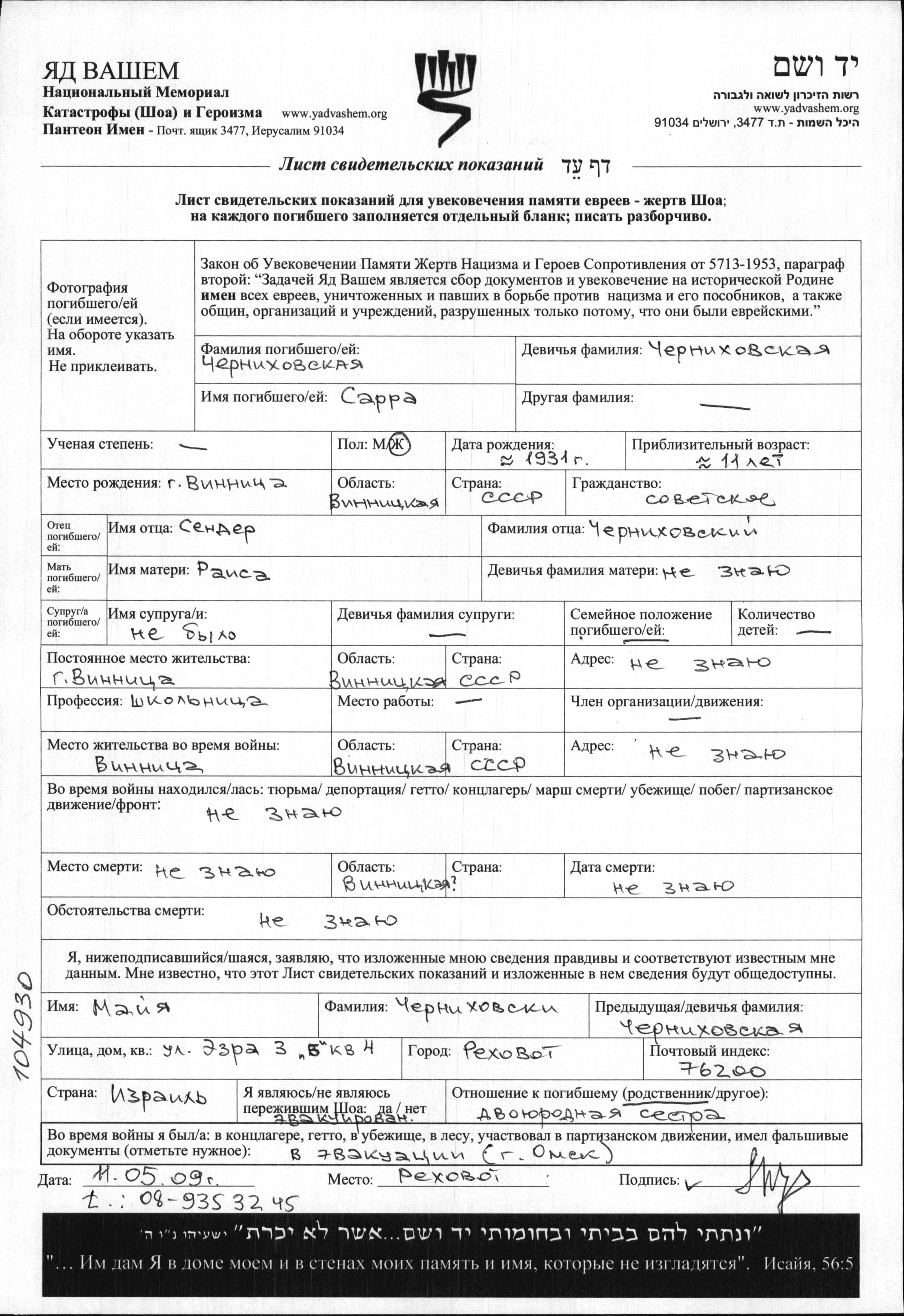 Chernikhovskaya Sarra 1931 Vinnitsa, Ukraine (URSS) Feuille de témoignage