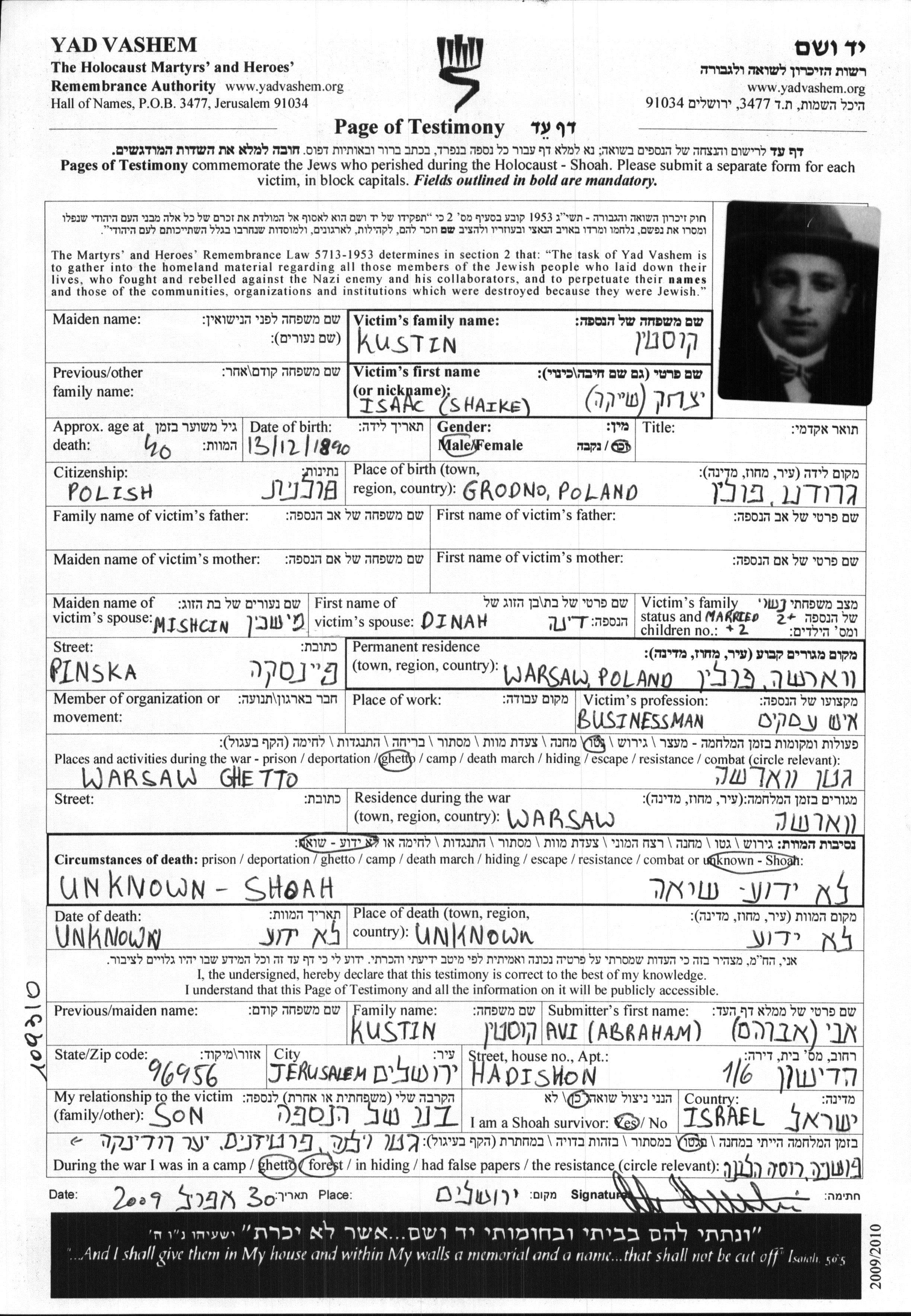 Kustin Isaak Shaike 1890 Warszawa, Pologne Feuille de témoignage