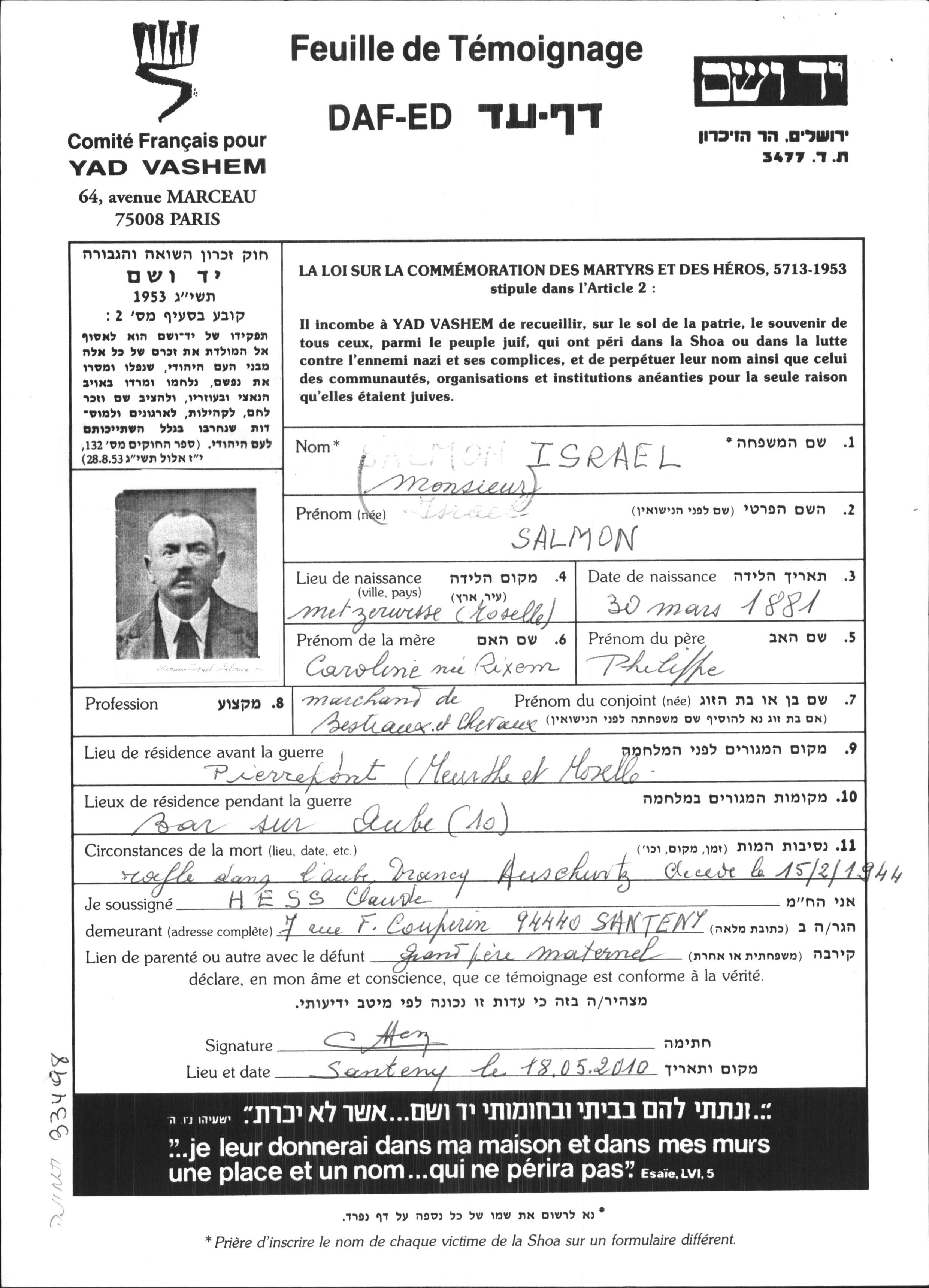 Salmon Israel est né à Metzervisse, France en 1881. Il était Négociant en bétail. Avant la seconde guerre mondiale il vivait à Pierrepont, France.