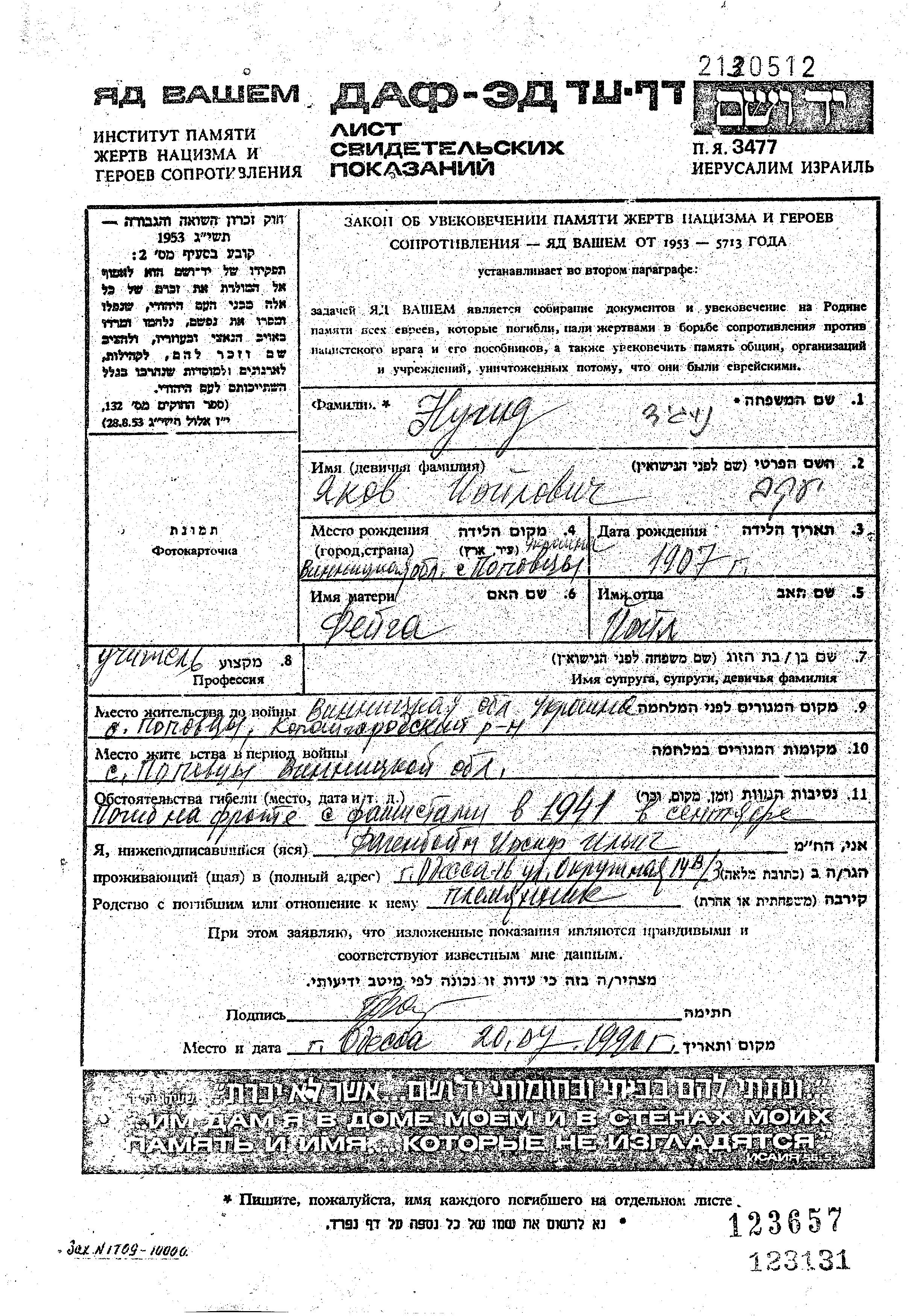 Nugid Yaakov 1907 Popovtsy, Ukraine (URSS) Feuille de témoignage