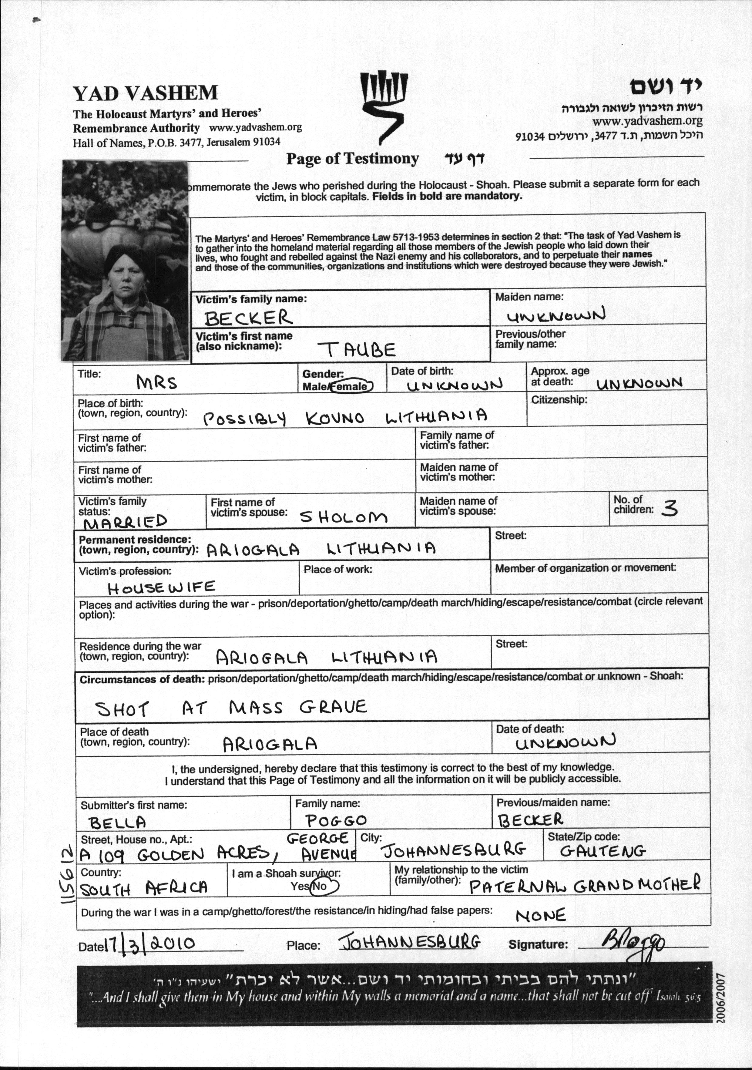 Becker Taube Ariogala, Lituanie Feuille de témoignage