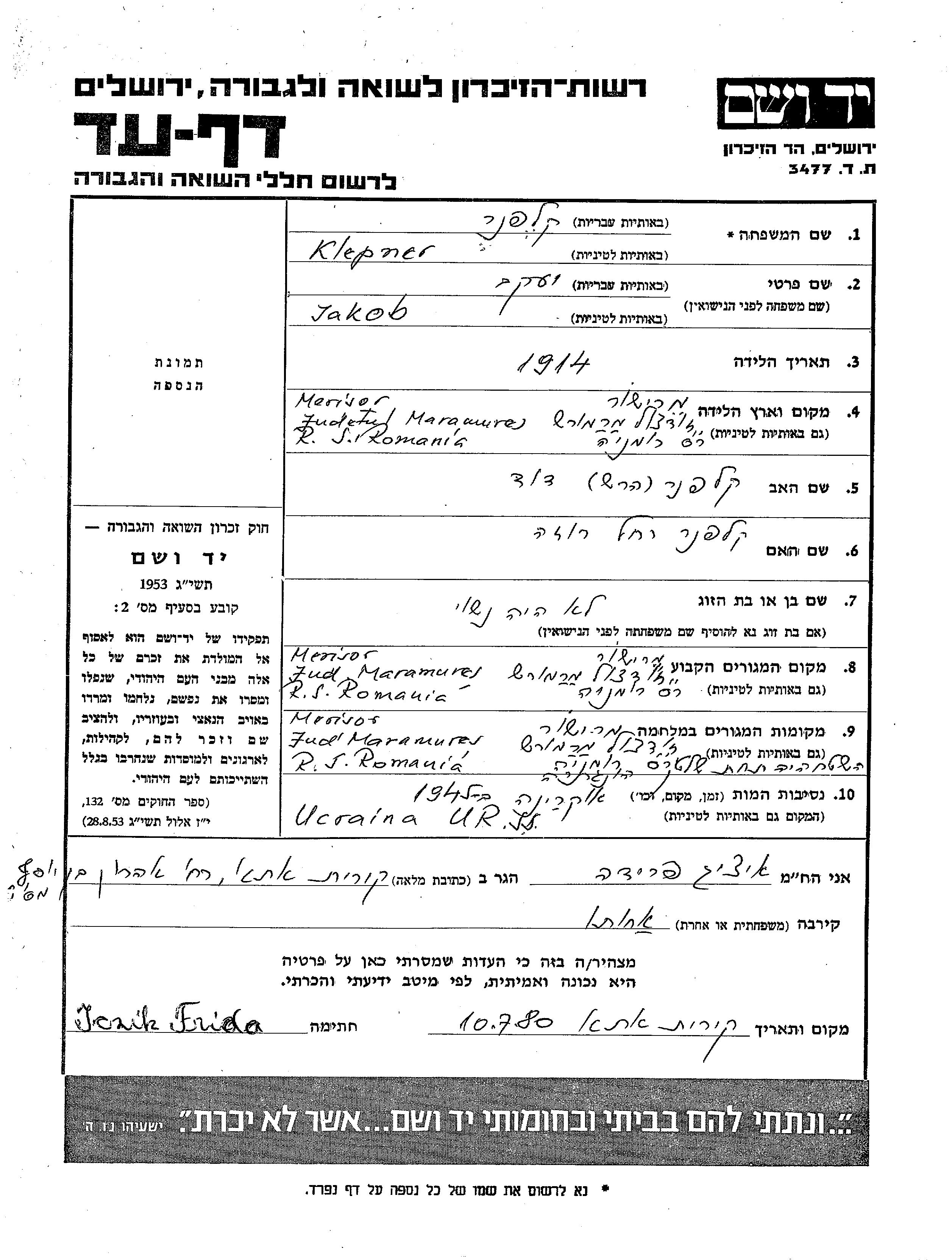 Klepner Jakob 1914 Merisor, Roumanie Feuille de témoignage