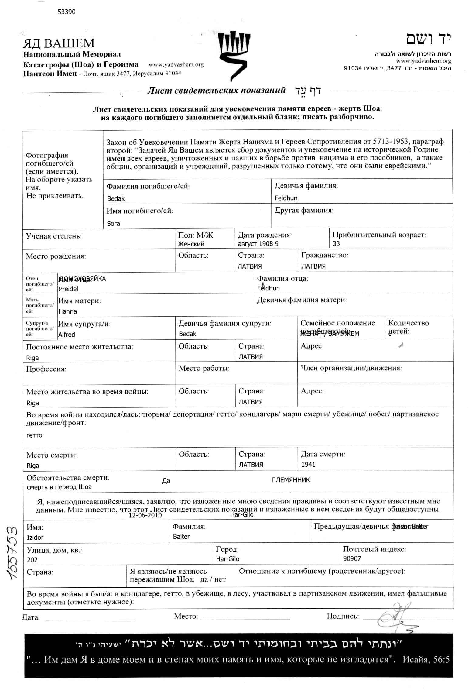 Bedak | Sora | 1908 | Riga, Lettonie | Feuille de témoignage (digitale-signée) |