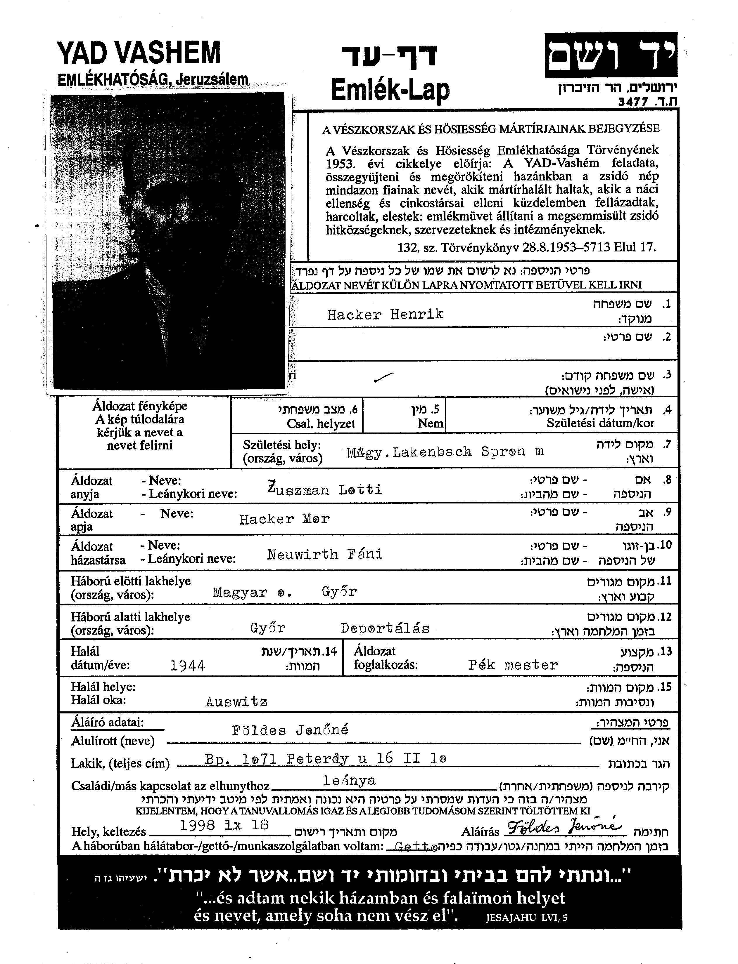 Haker Henrik Gyor, Hongrie Feuille de témoignage
