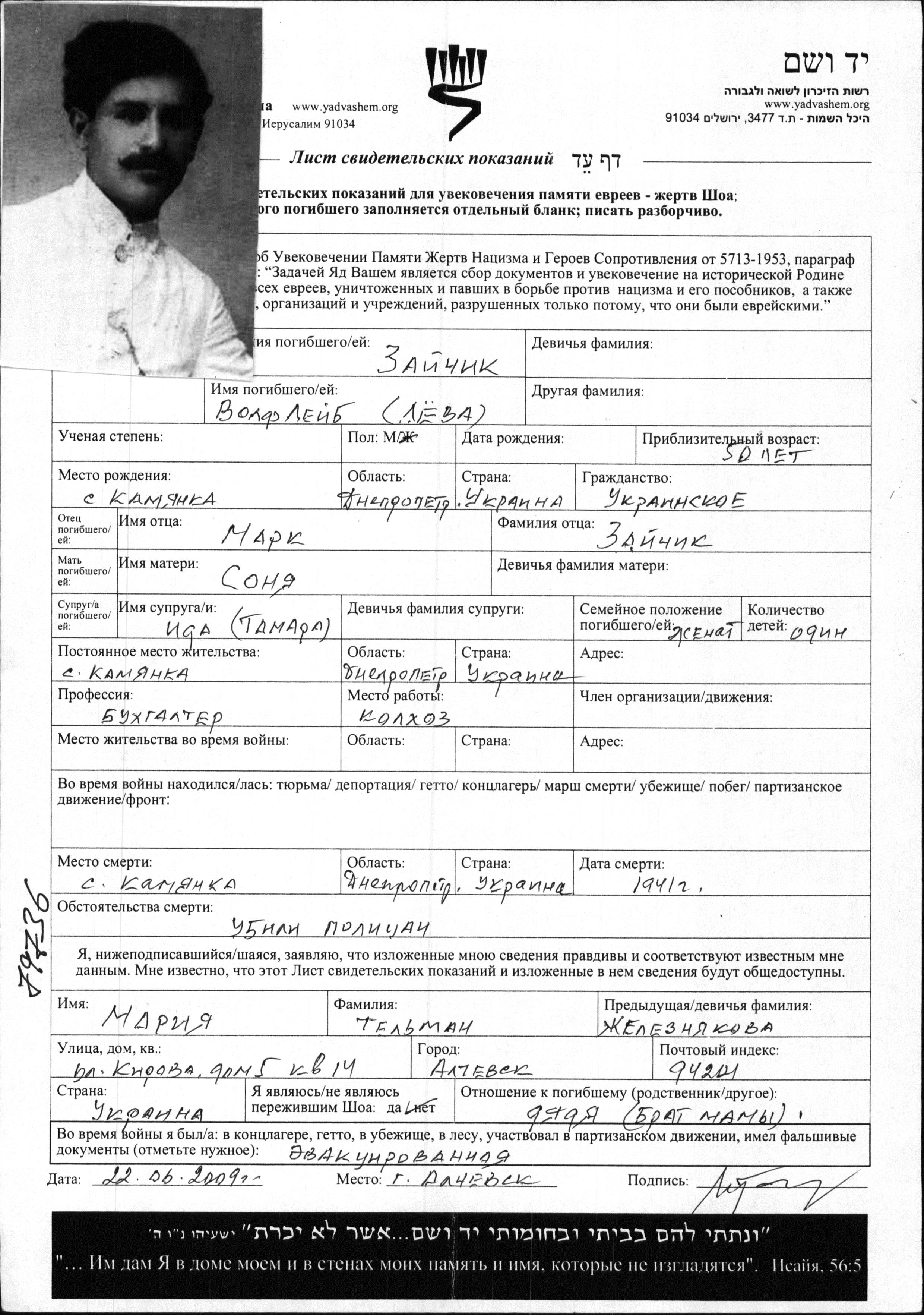 Zaychik | Volf Leyb Lyova | Kamenka, Ukraine (URSS) | Feuille de témoignage | |