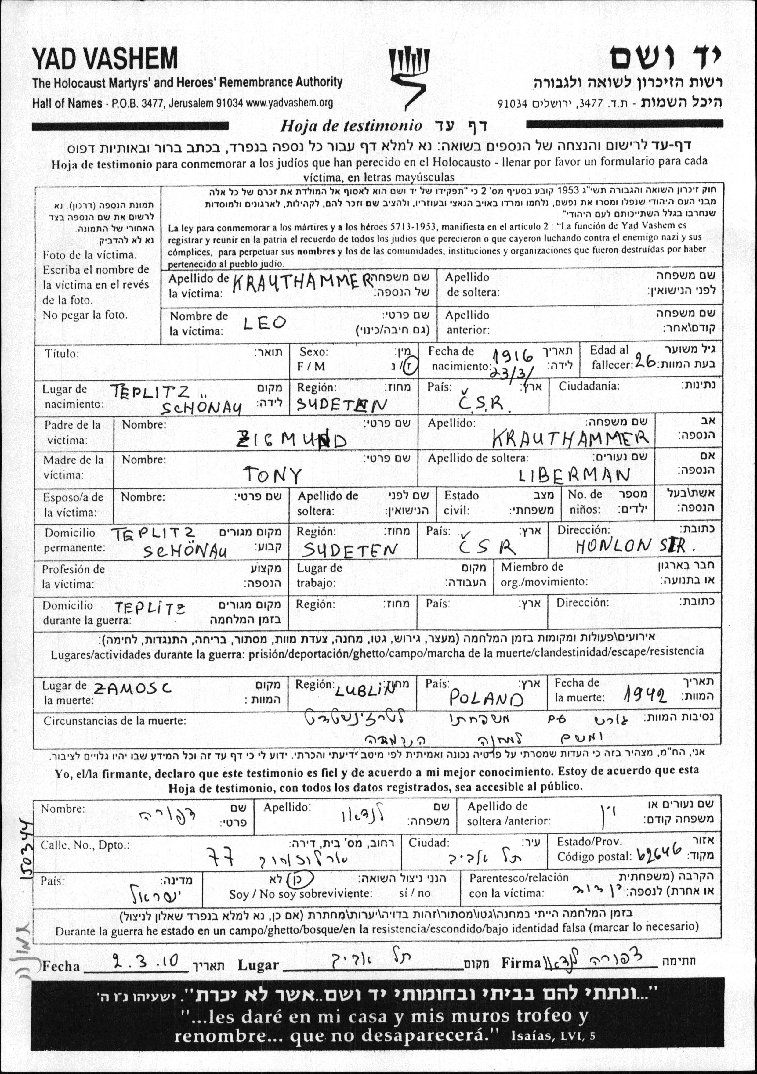 Krauthammer | Leo | 1916 | Teplitz Schoenau, Tchécoslovaquie | Feuille de témoignage |