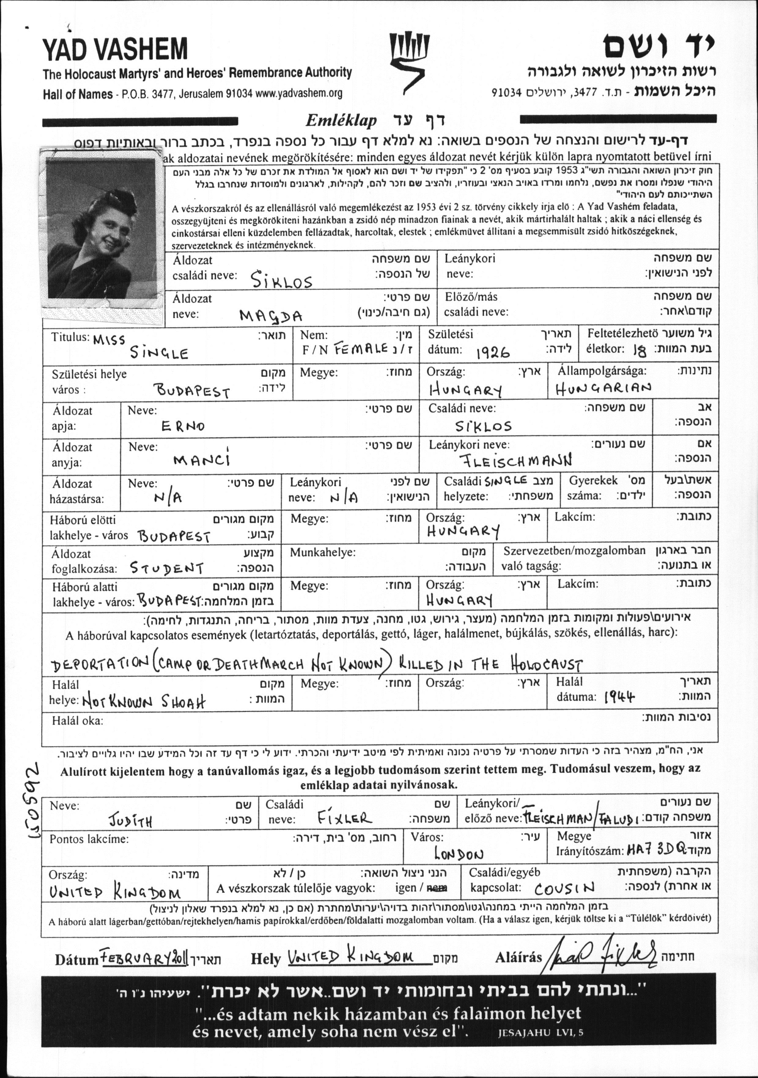 Siklos Magda 1926 Budapest, Hongrie Feuille de témoignage