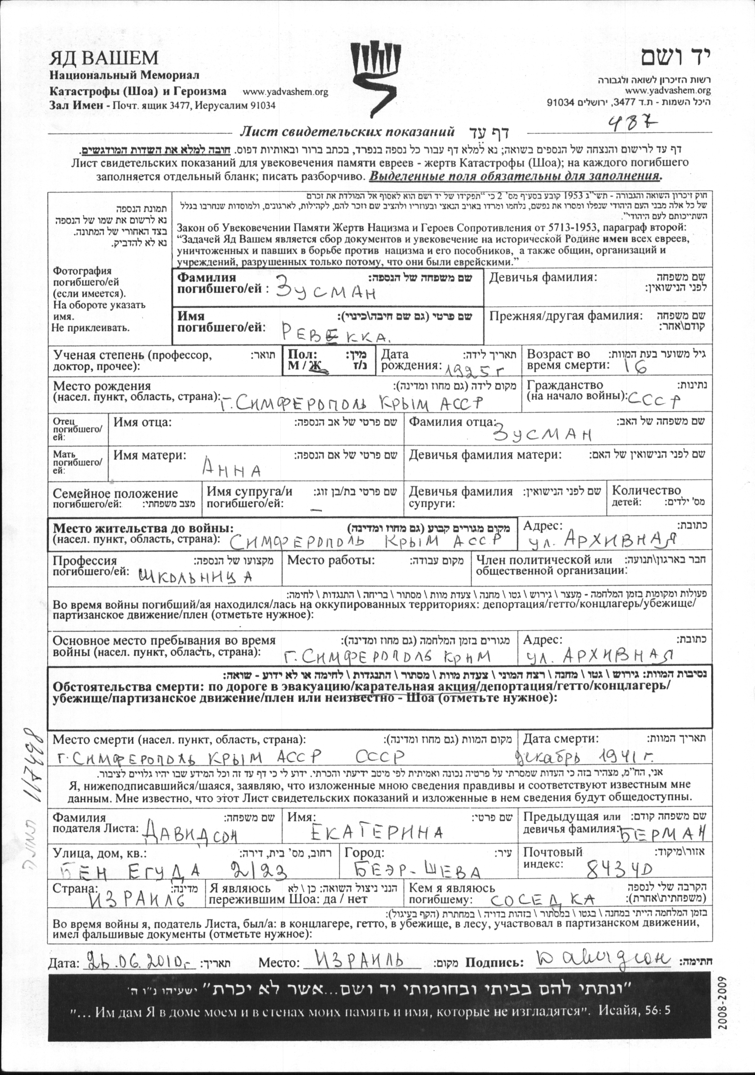 Zusman Revekka 1925 Simferopol, Russie (URSS) Feuille de témoignage