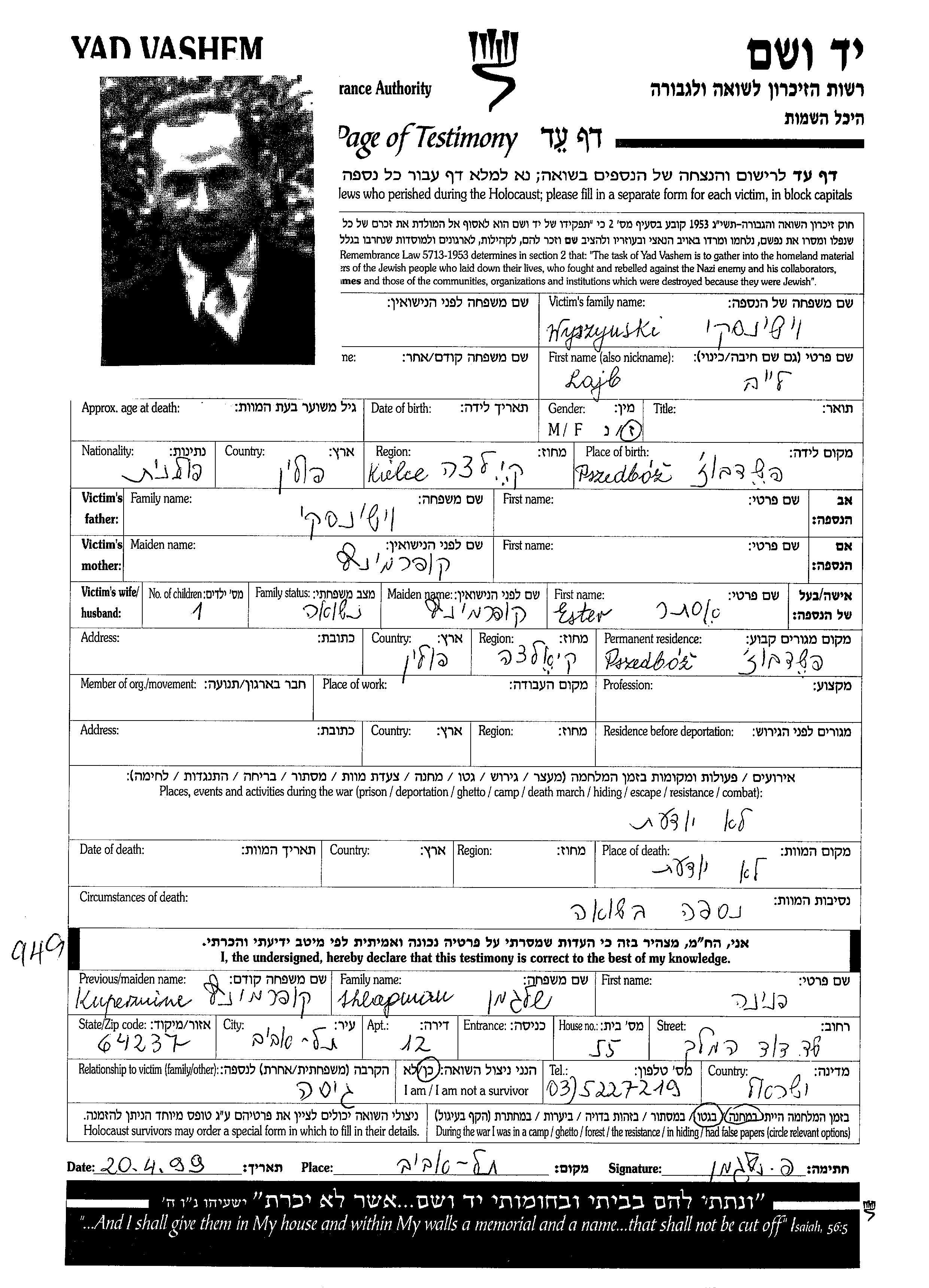 Wyszynski Lajb Przedborz, Pologne Feuille de témoignage