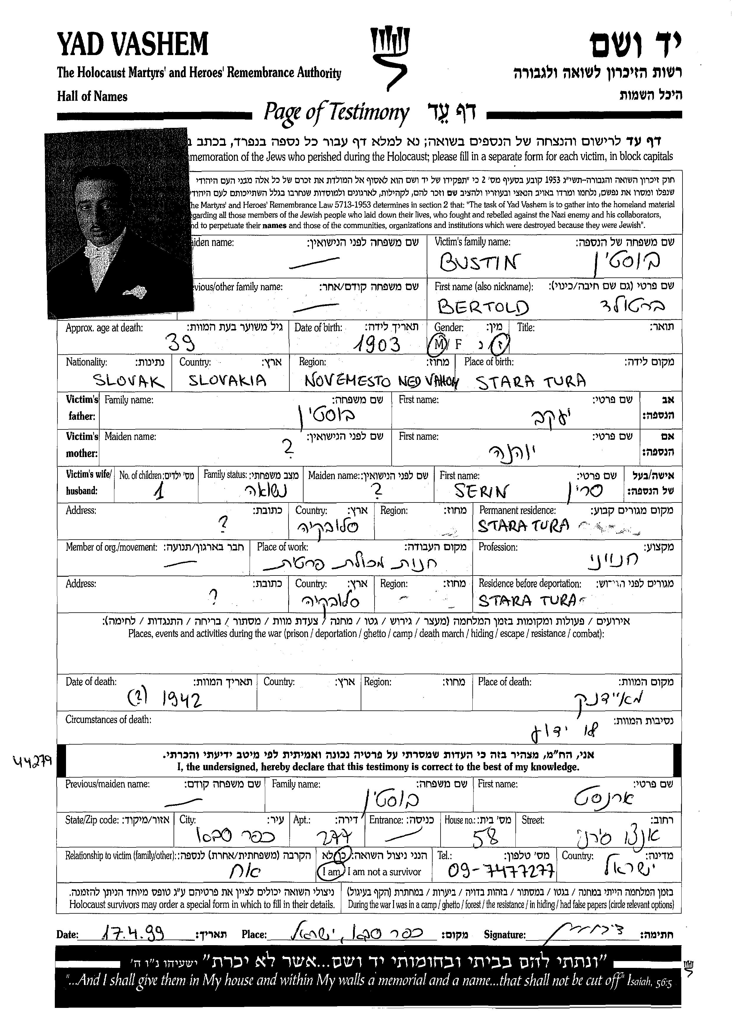 Bustin Bertold 1903 Stara Tura, Tchécoslovaquie Feuille de témoignage