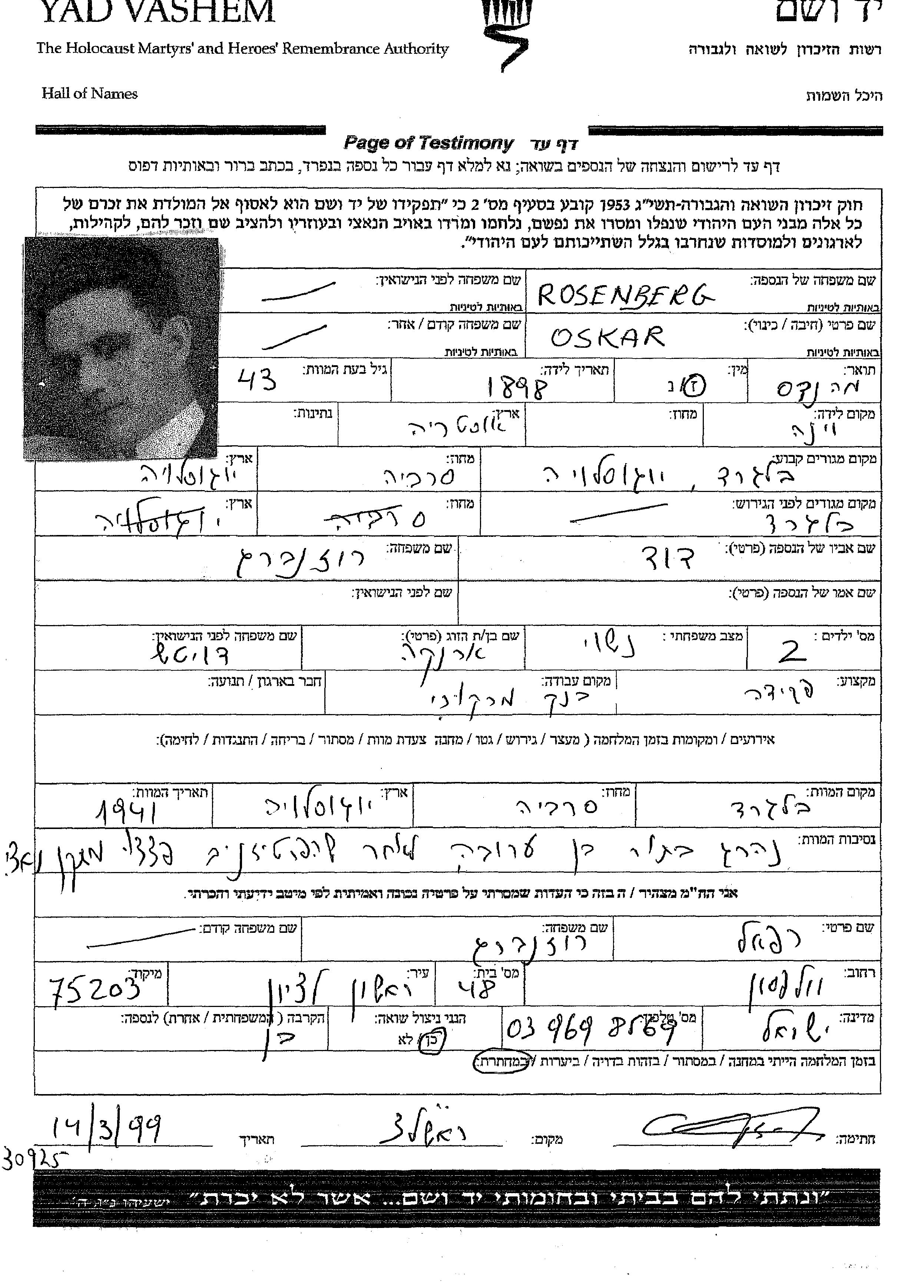 Rosenberg Oskar 1898 Belgrad, Yugoslavie Feuille de témoignage