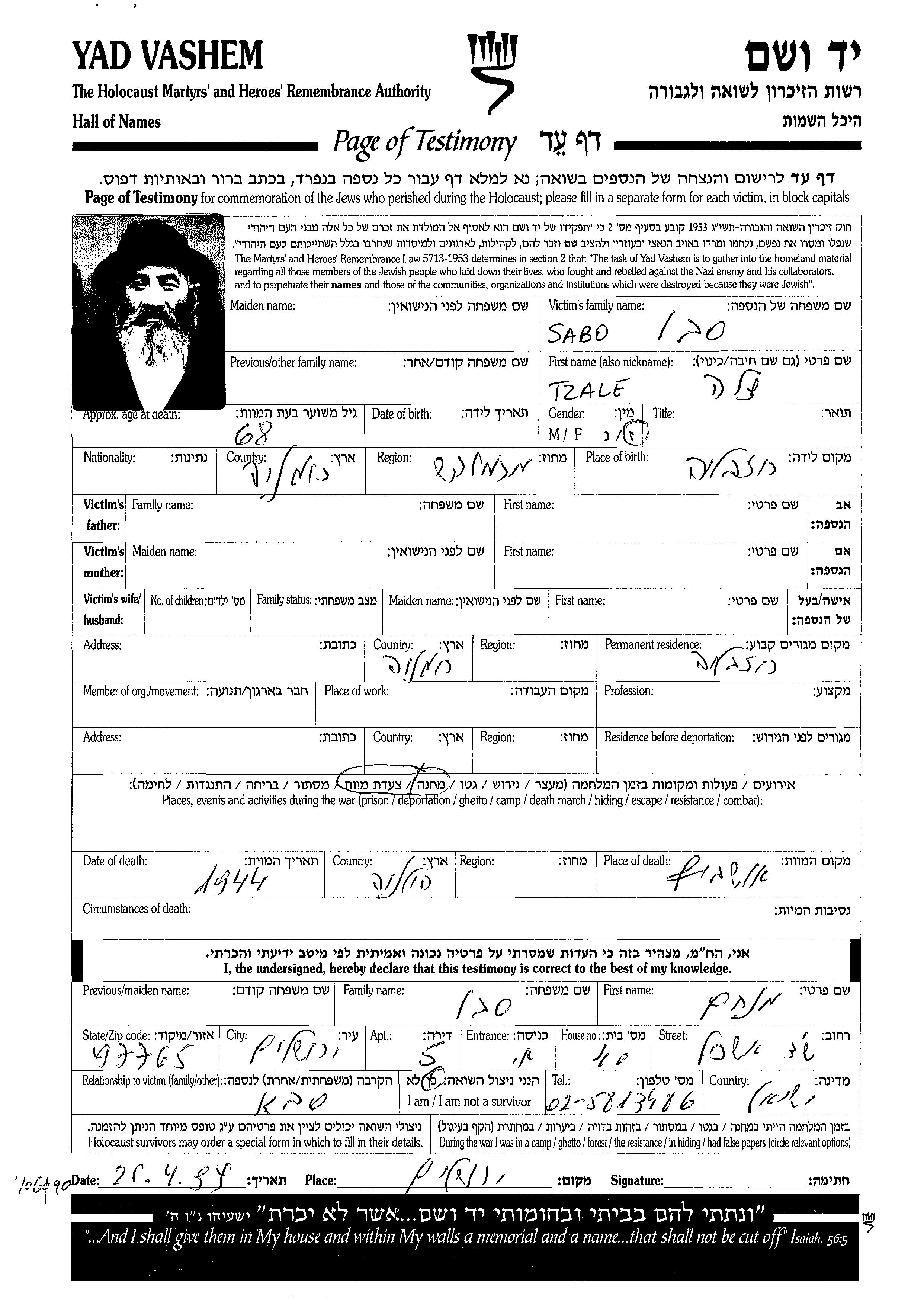 Tzila Zala Tzale Sabo est né à Rozavlea, Roumanie. Avant la seconde guerre mondiale il vivait à Rozavlea, Roumanie.
