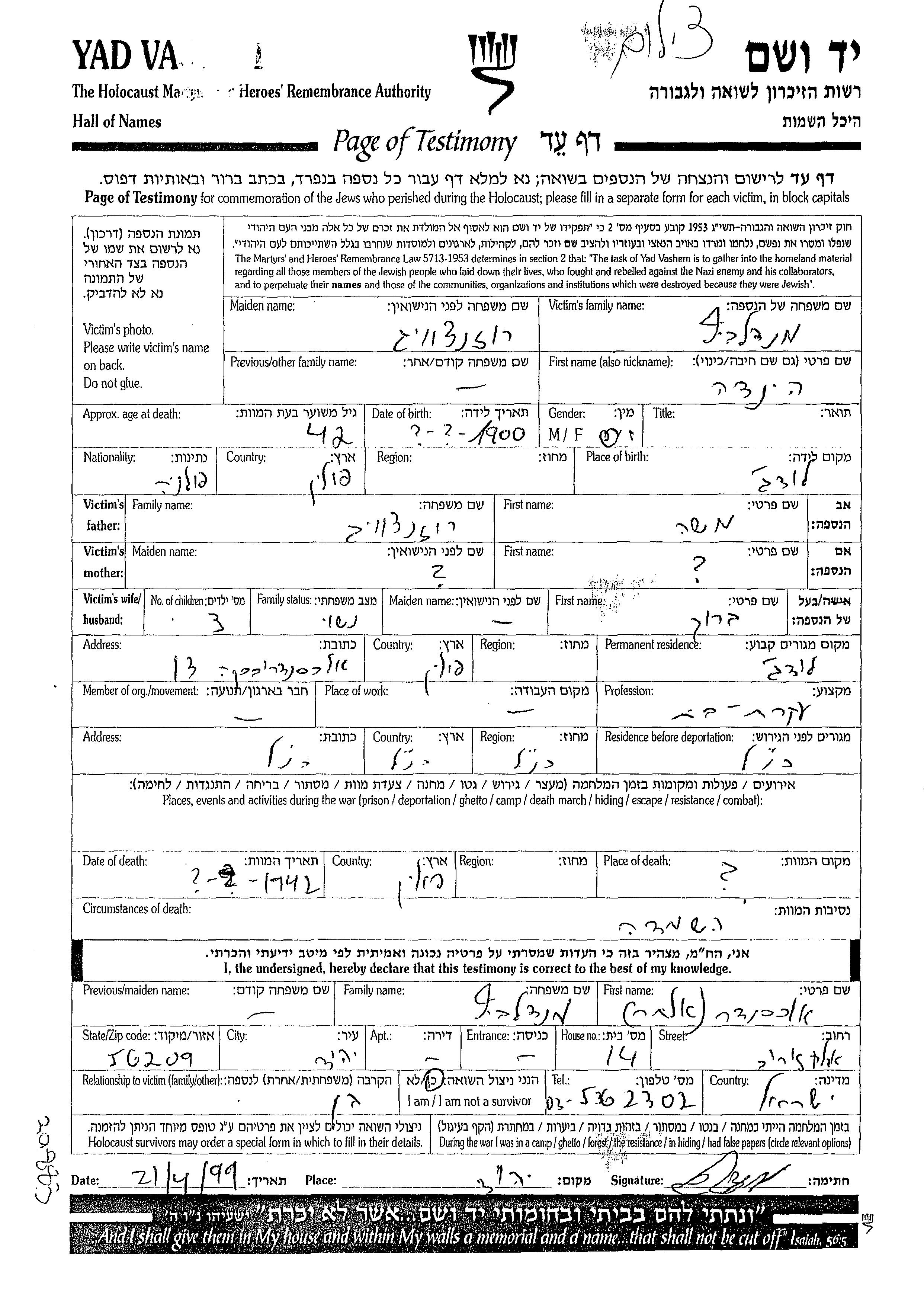 Yad Vashem - Pages of Testimony Names Memorial Collection