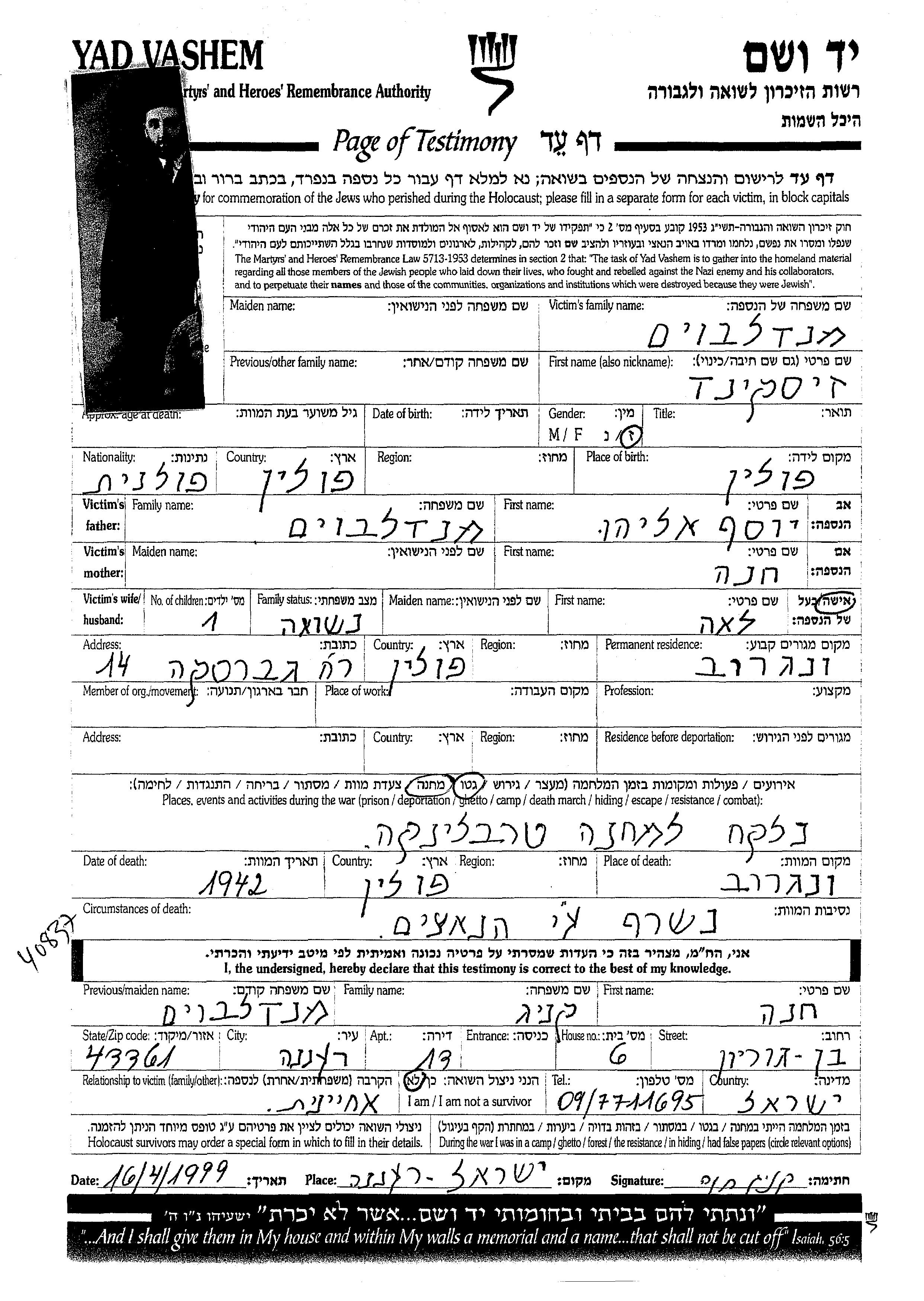 Yad Vashem - Pages of Testimony Names Memorial Collection