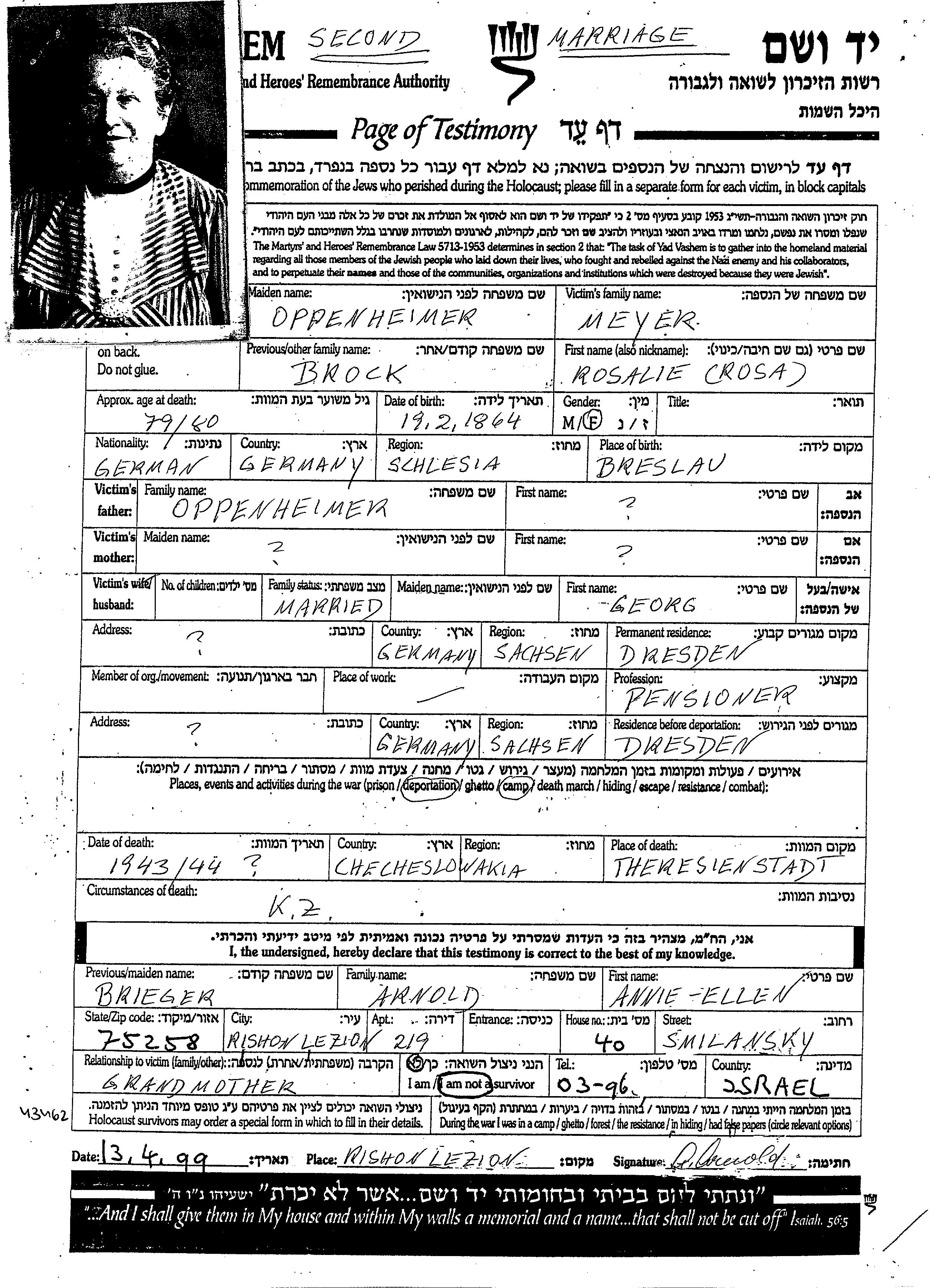 Rosalie Meyer Brock née Oppenheimer est née à Breslau, Allemagne en 1864. Elle était Retraité/e. Avant la seconde guerre mondiale elle vivait à Dresden, Allemagne. Rosalie a été assassinée pendant la Shoah. Lieu de la mort: Terezin, Tchécoslovaquie en 1943.