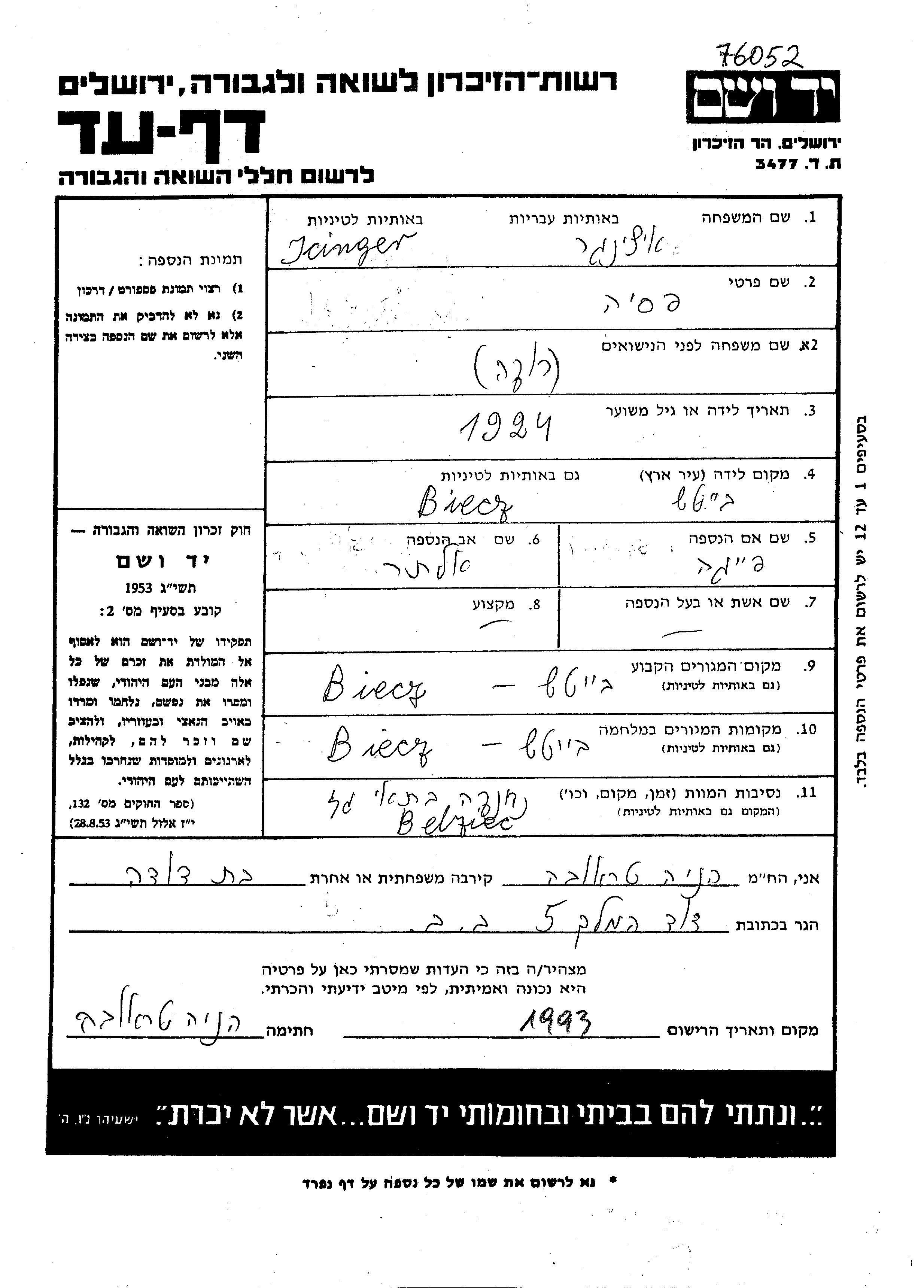 Icinger Pesia 1924 Biecz, Pologne Feuille de témoignage