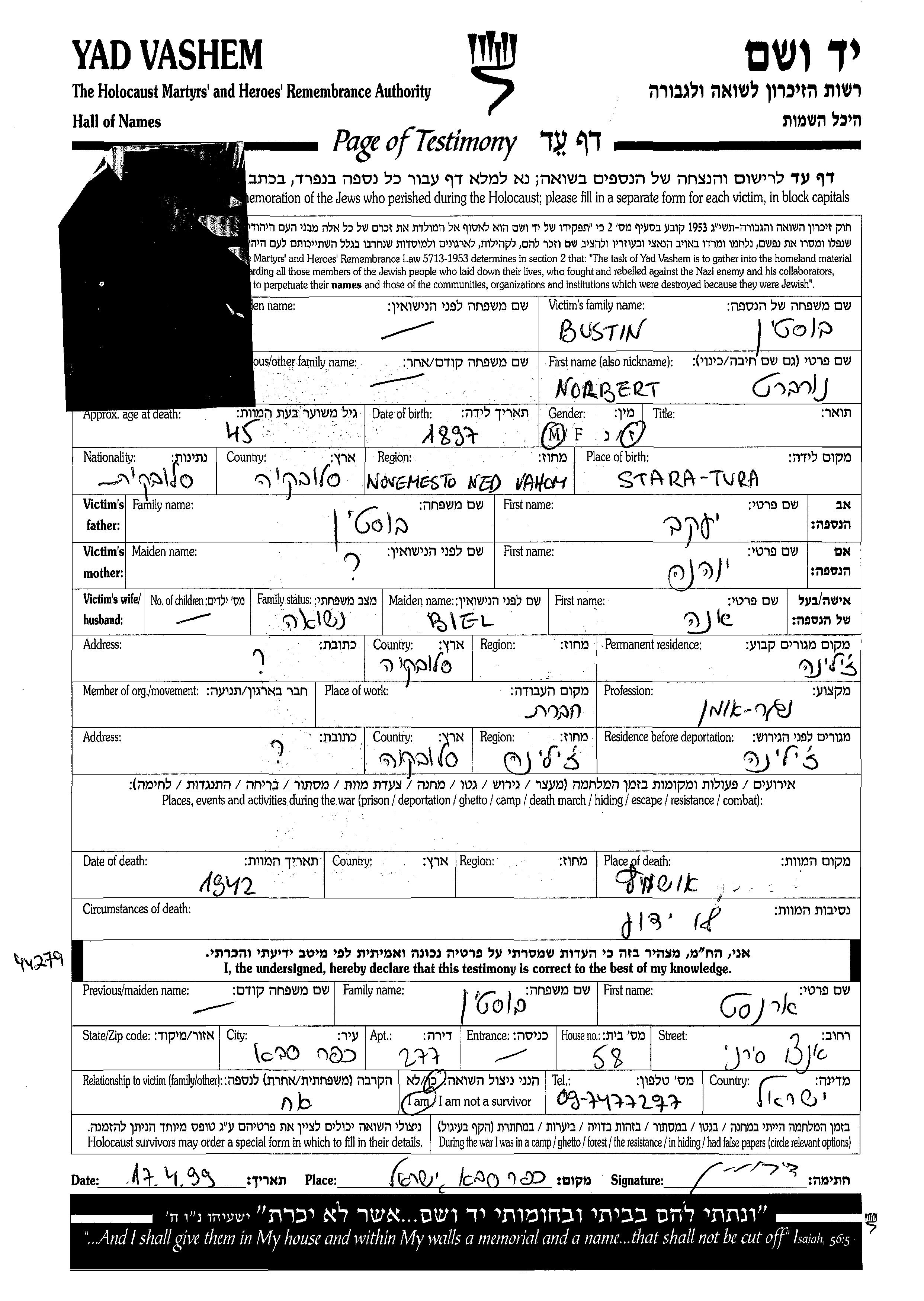 Bustin Norbert 1897 Zilina, Tchécoslovaquie Feuille de témoignage