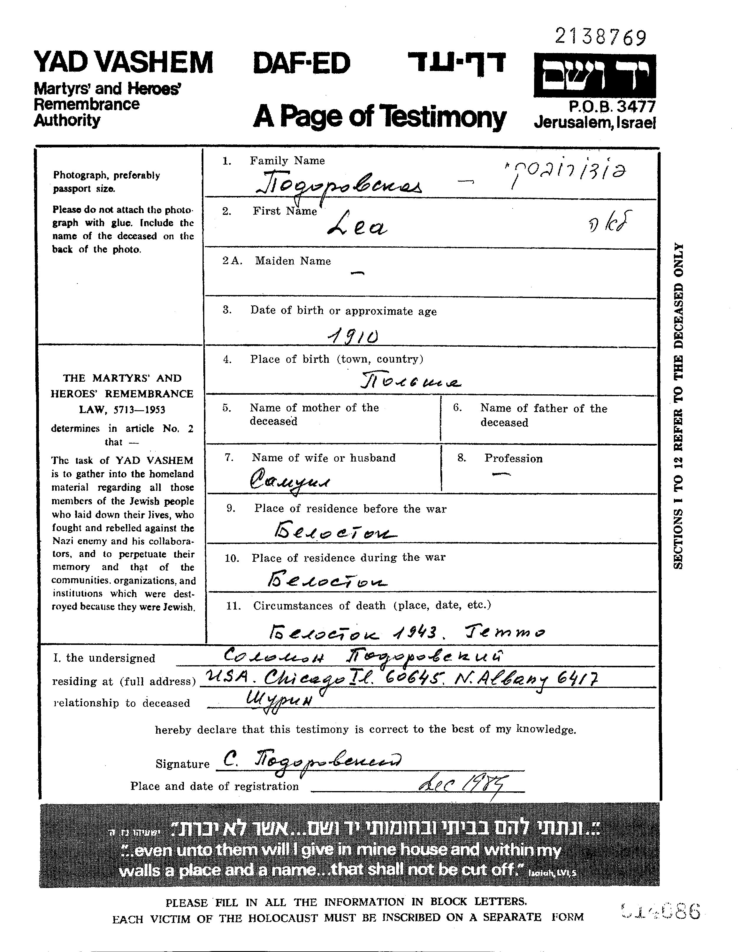Podorovski Liza Lea Bialystok, Pologne Feuille de témoignage