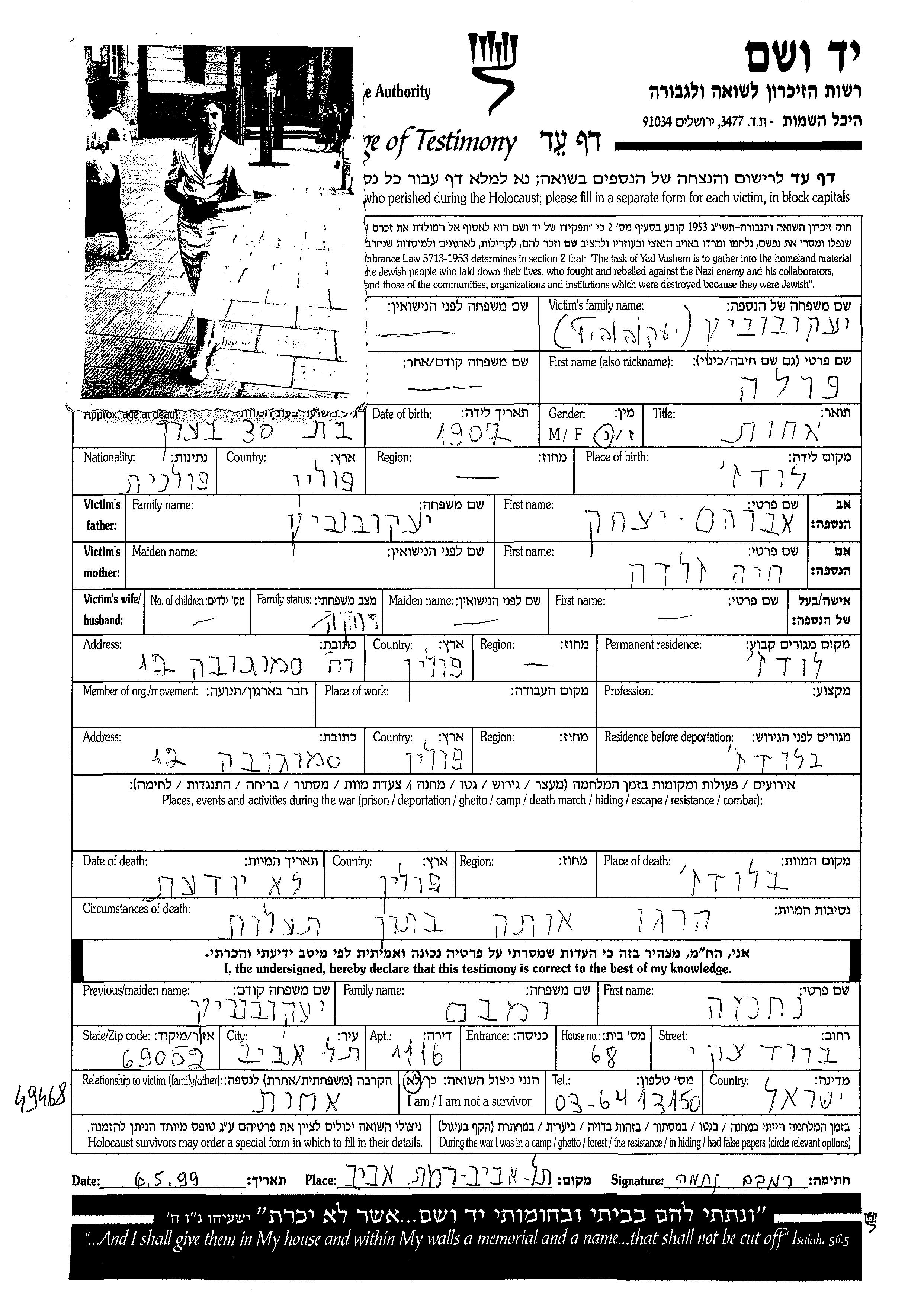 Yakubovitz | Perla Pola | 1907 | Lodz, Pologne | Feuille de témoignage |