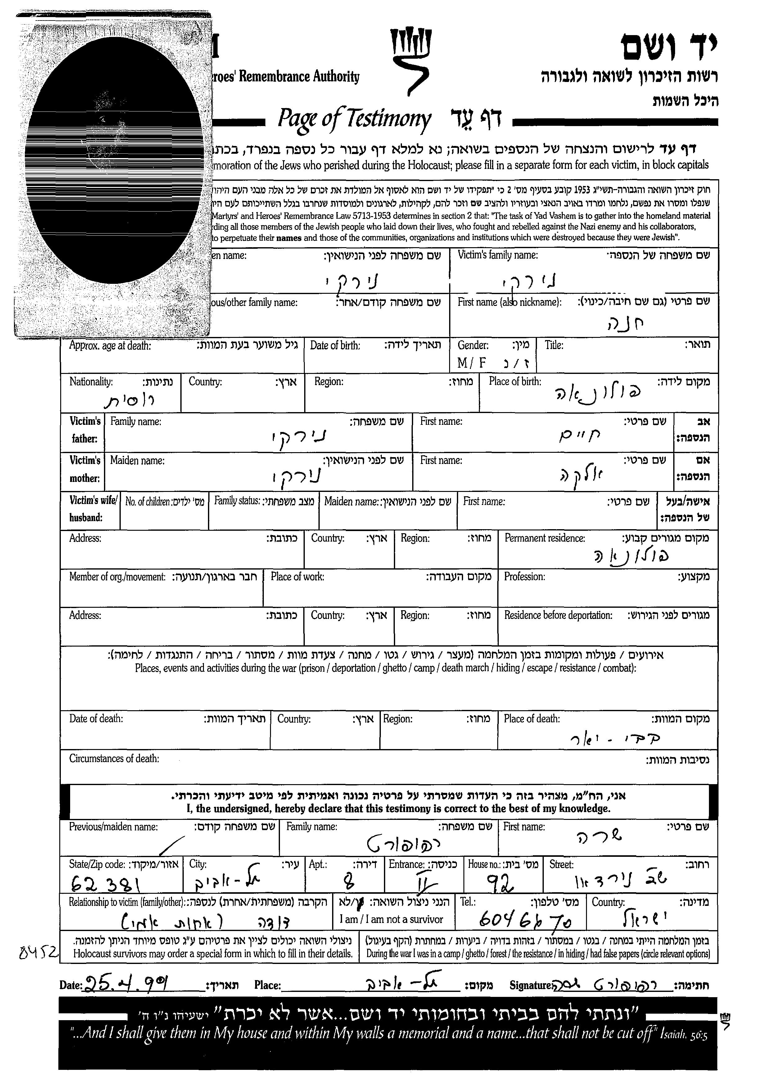 Yad Vashem - Pages of Testimony Names Memorial Collection