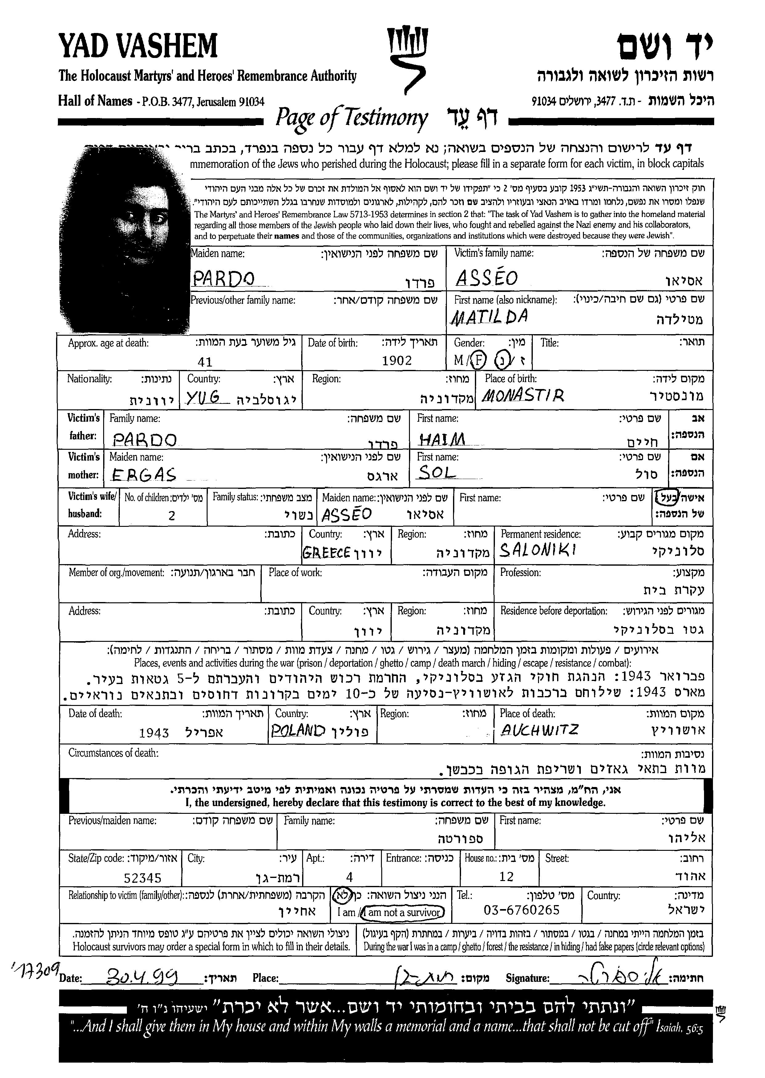 Matilda Asseo née Pardo est née à Bitolj, Yugoslavie en 1902. Elle était Femme au foyer. Avant la seconde guerre mondiale elle vivait à Thessaloniki, Grèce.