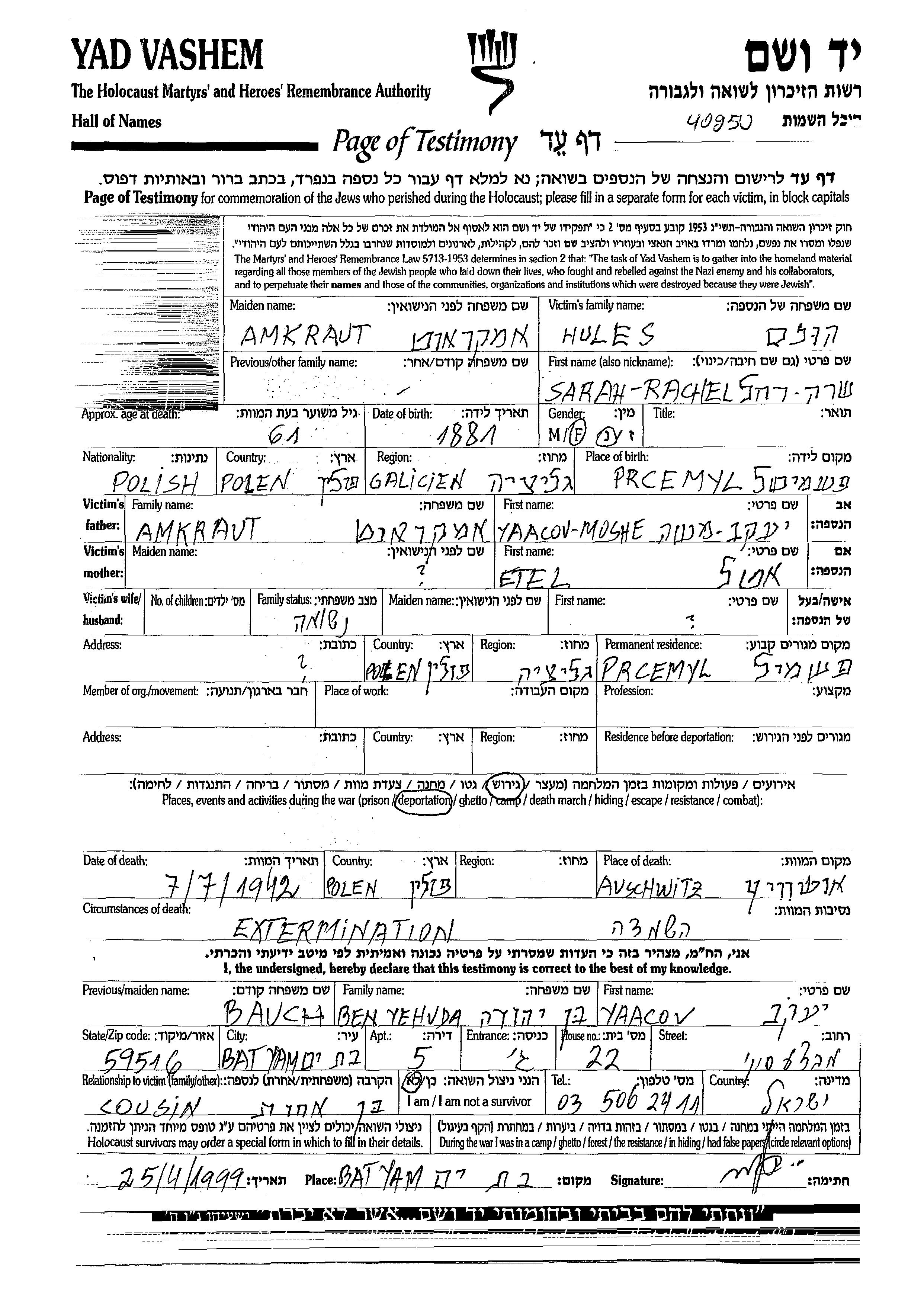 Sarah Rachel Hules née Amkraut est née à Galicia Region, Pologne en 1881. Avant la seconde guerre mondiale elle vivait à Galicia Region, Pologne.