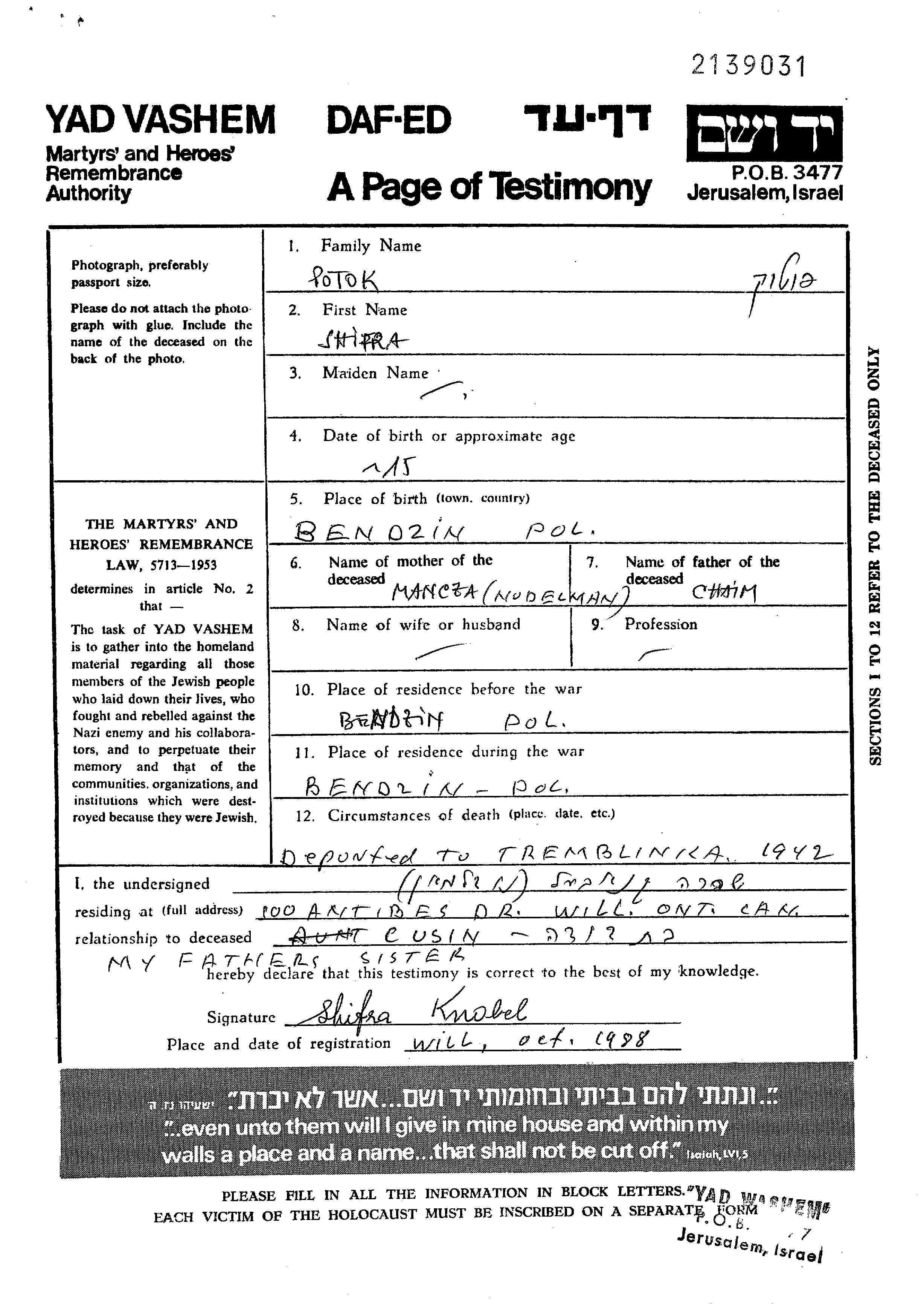 Potok Shifra Będzin, Pologne Feuille de témoignage