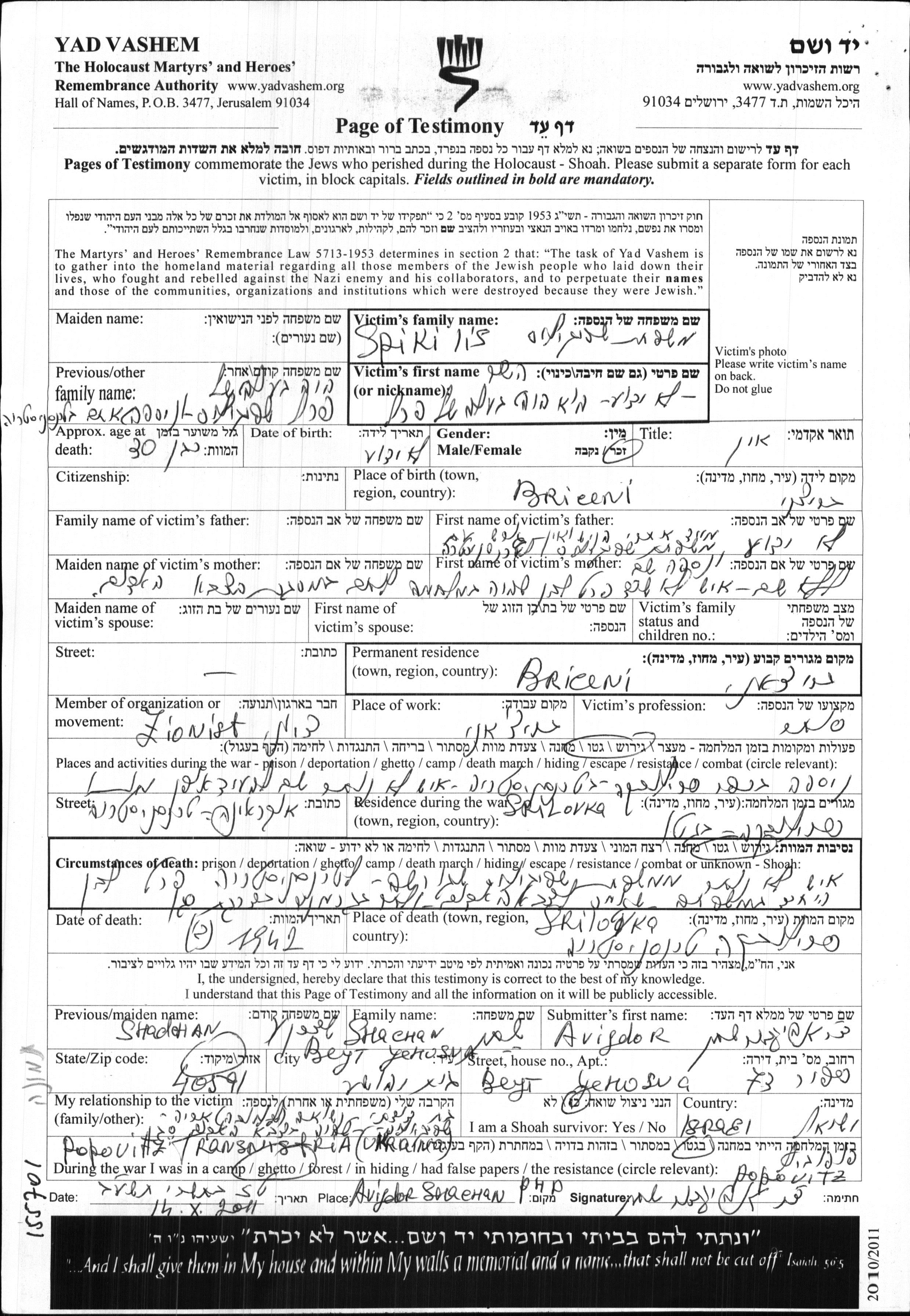 Spikilis prénom inconnu Briceni, Roumanie Feuille de témoignage