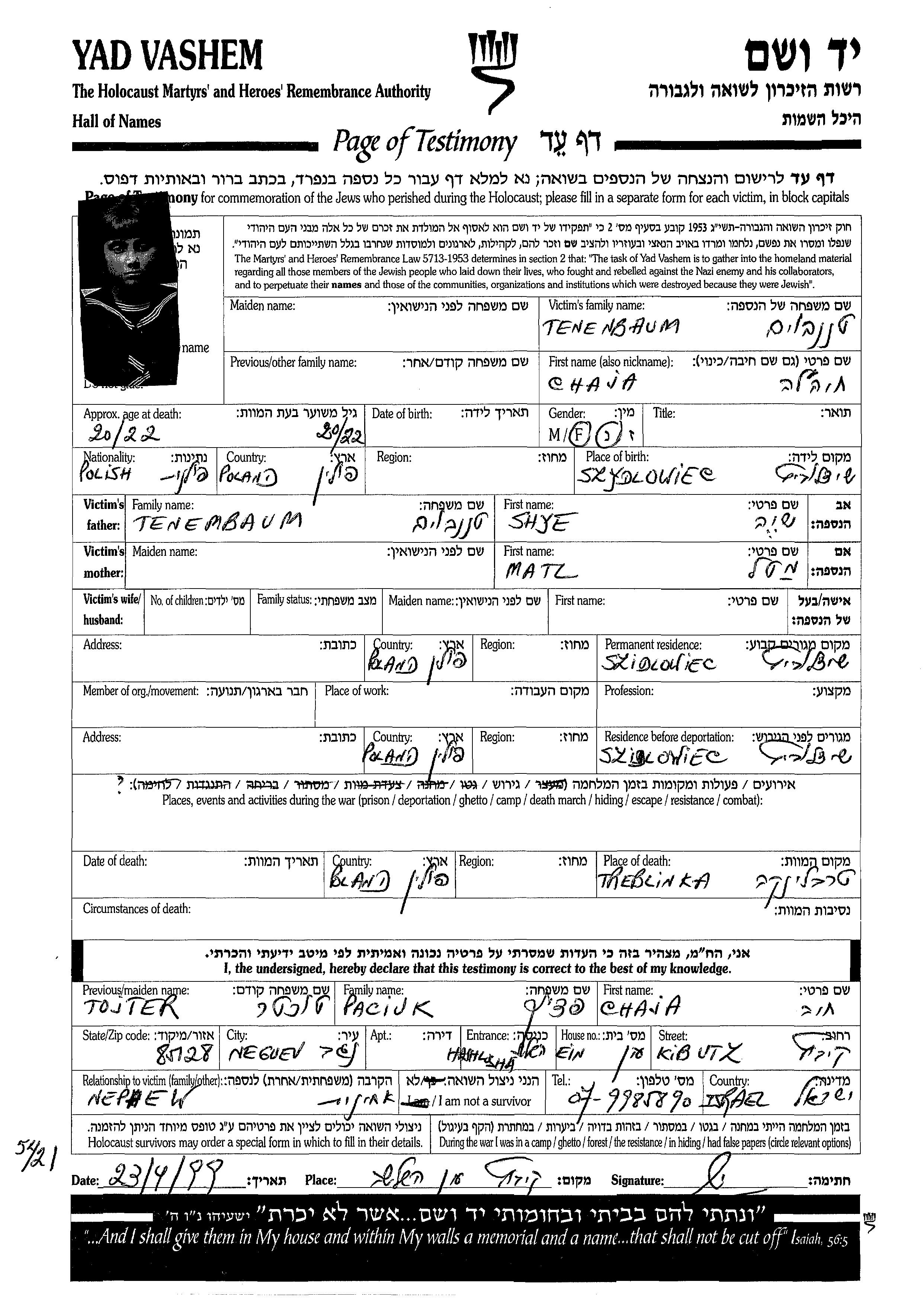 Tenenbaum Chaja Szydlowiec, Pologne Feuille de témoignage