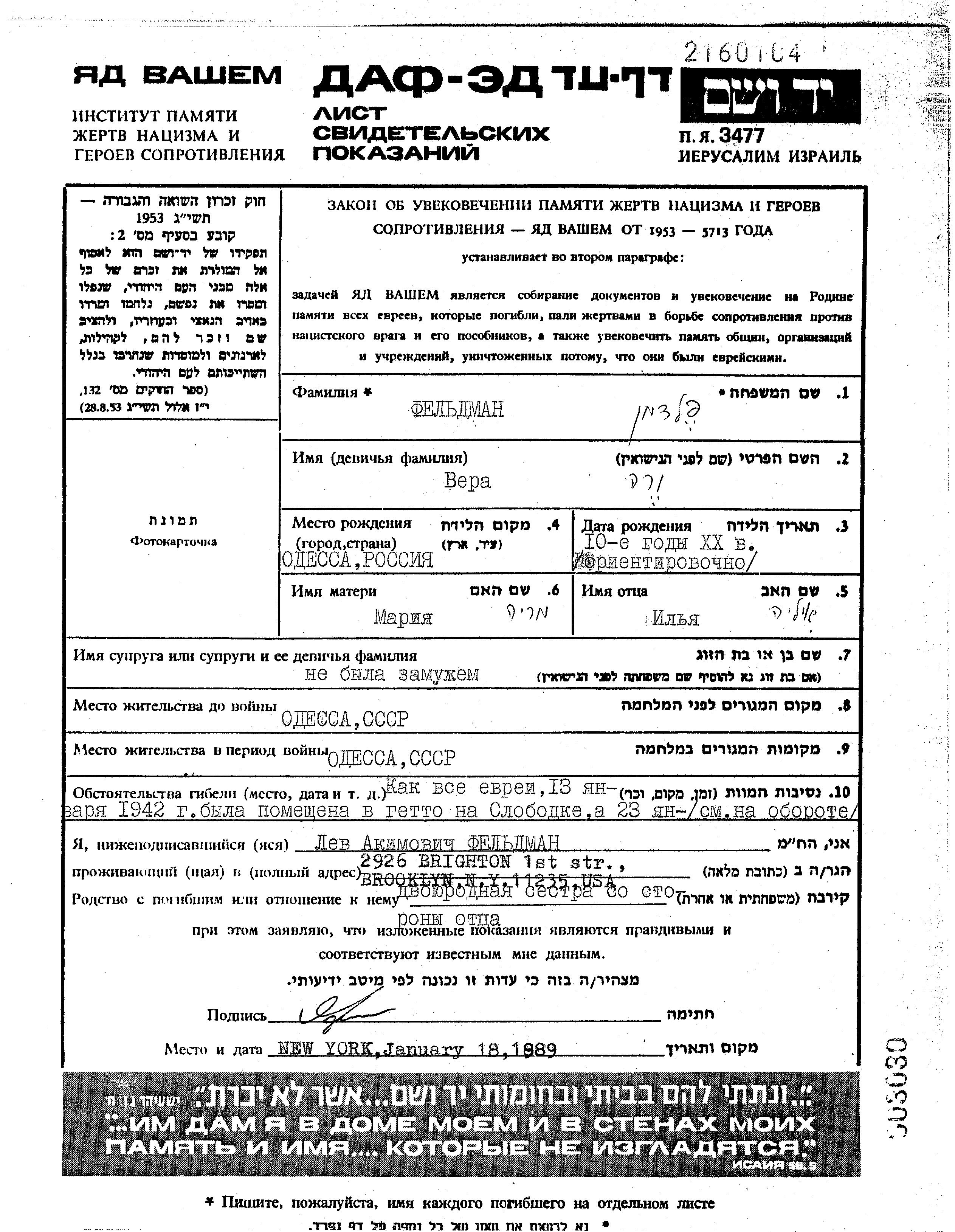 Feldman Vera Odessa, Ukraine (URSS) Feuille de témoignage