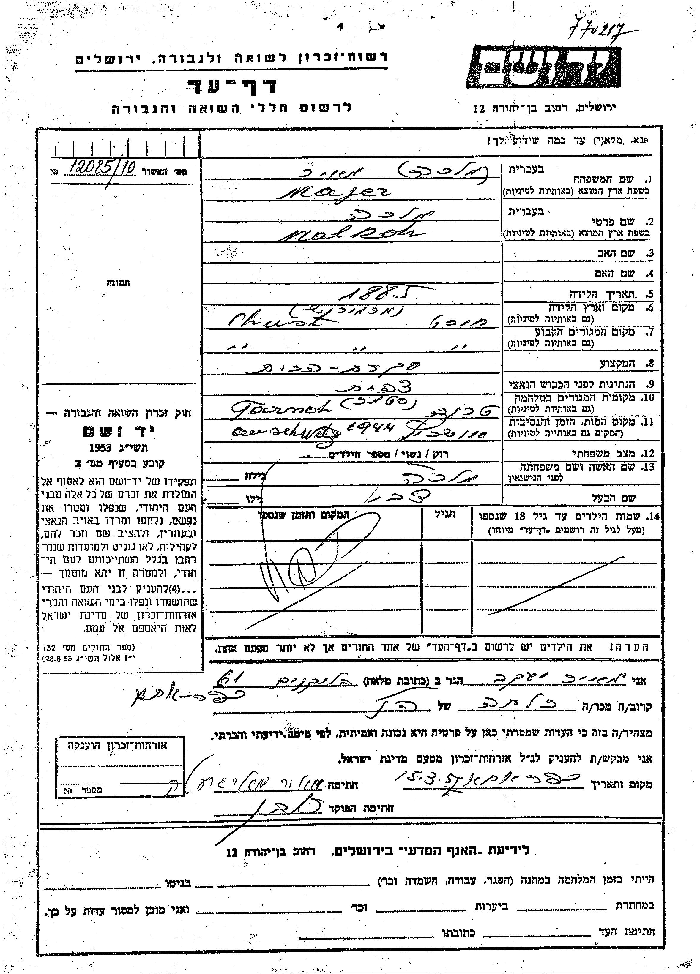 Majer Malkoh Malka 1885 Chust, Tchécoslovaquie Feuille de témoignage