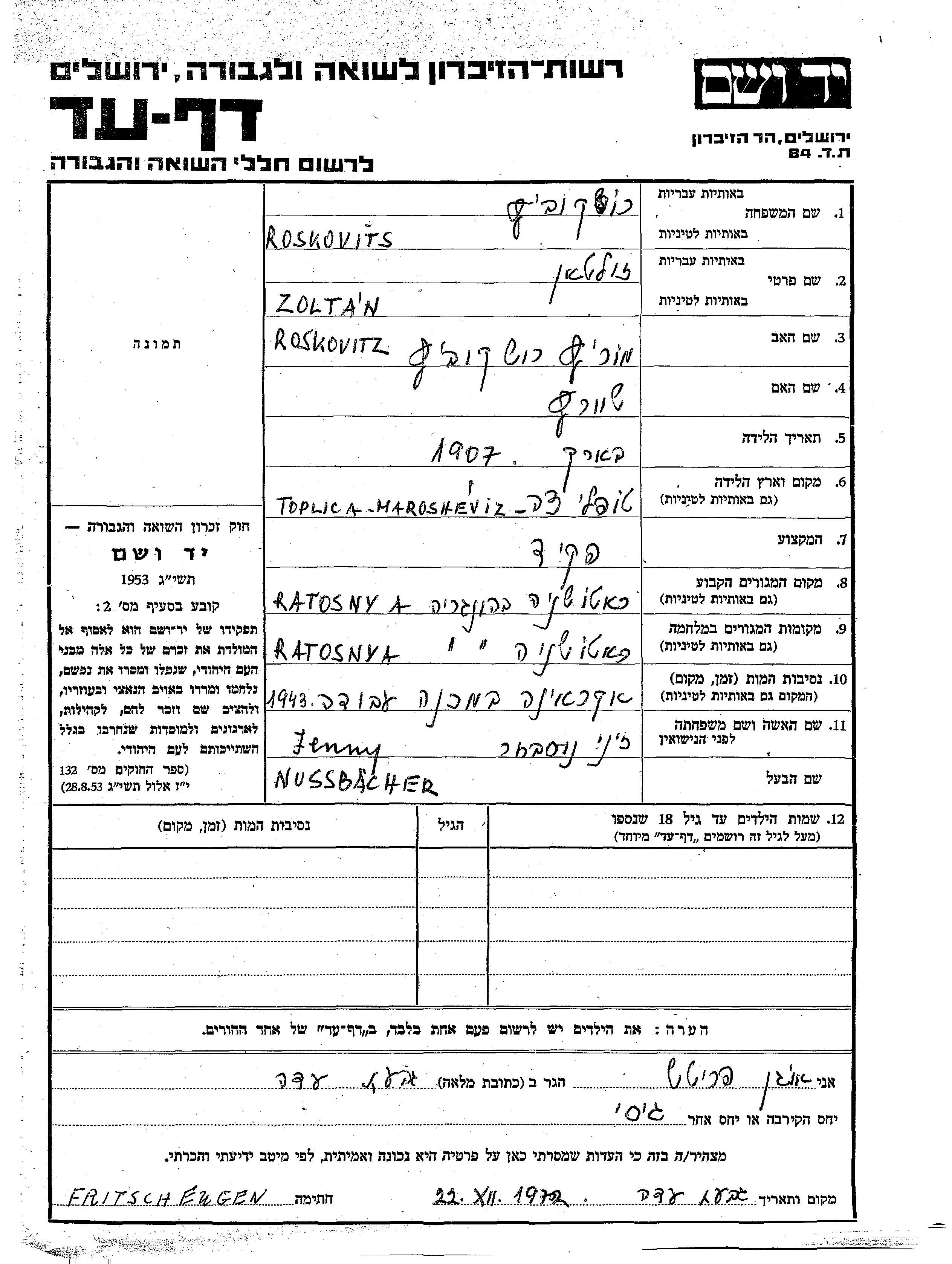 Zoltan Roskovits est né à Toplica, Roumanie en 1907, fils de Moritz née Shvartz. Il était Employé/e de bureau. Avant la seconde guerre mondiale il vivait à Ratosnya, Roumanie. Au cours de la guerre, il était à Ratosnya, Roumanie.