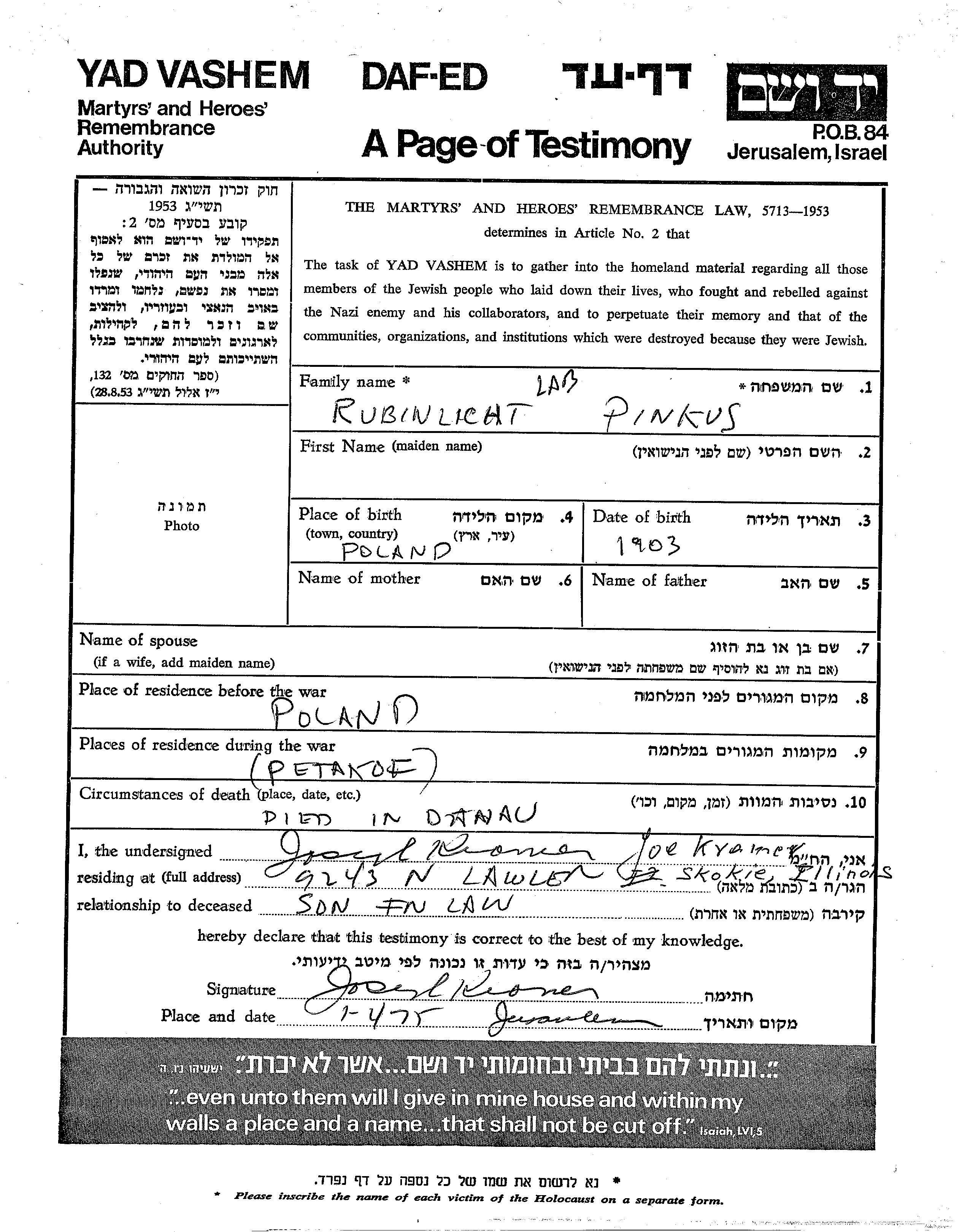 Pinkhas Lab Rubinlicht est né à Pologne en 1903. Avant la seconde guerre mondiale il vivait à Pologne. Au cours de la guerre, il était à Piotrkow, Pologne.