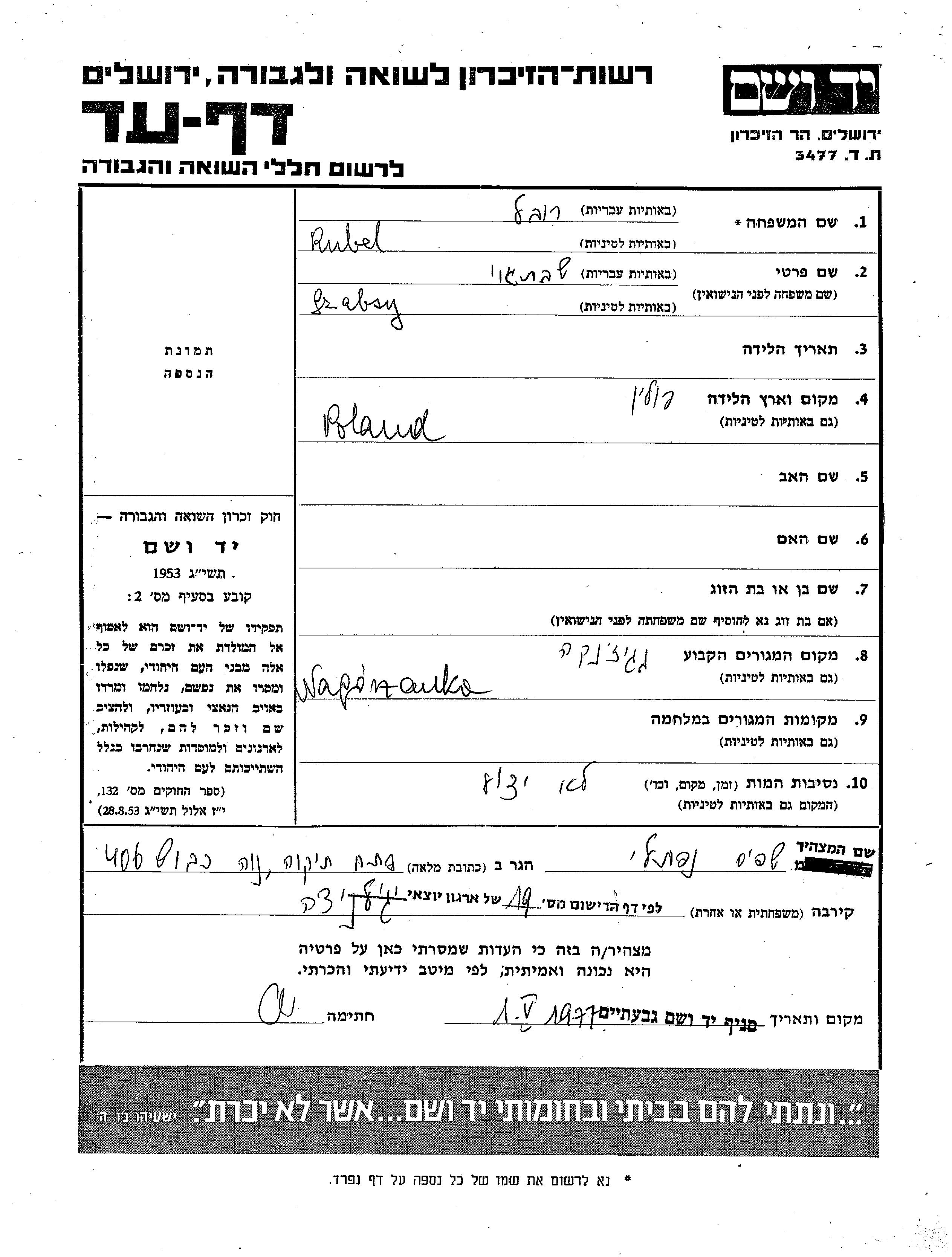 Rubel Szabsy Nagorzanka, Pologne Feuille de témoignage