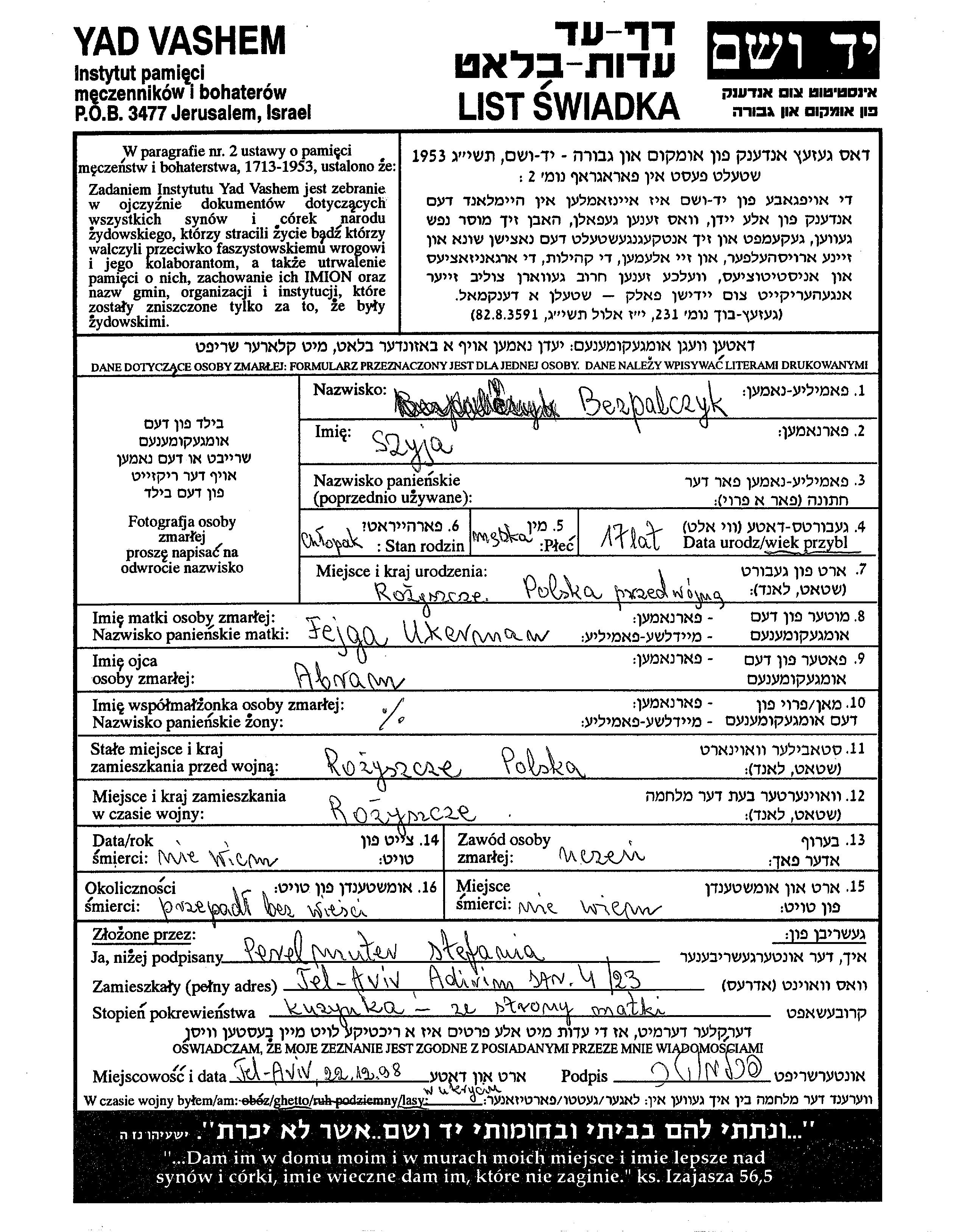 Bezpalczyk Szyja Rozyszcze, Pologne Feuille de témoignage
