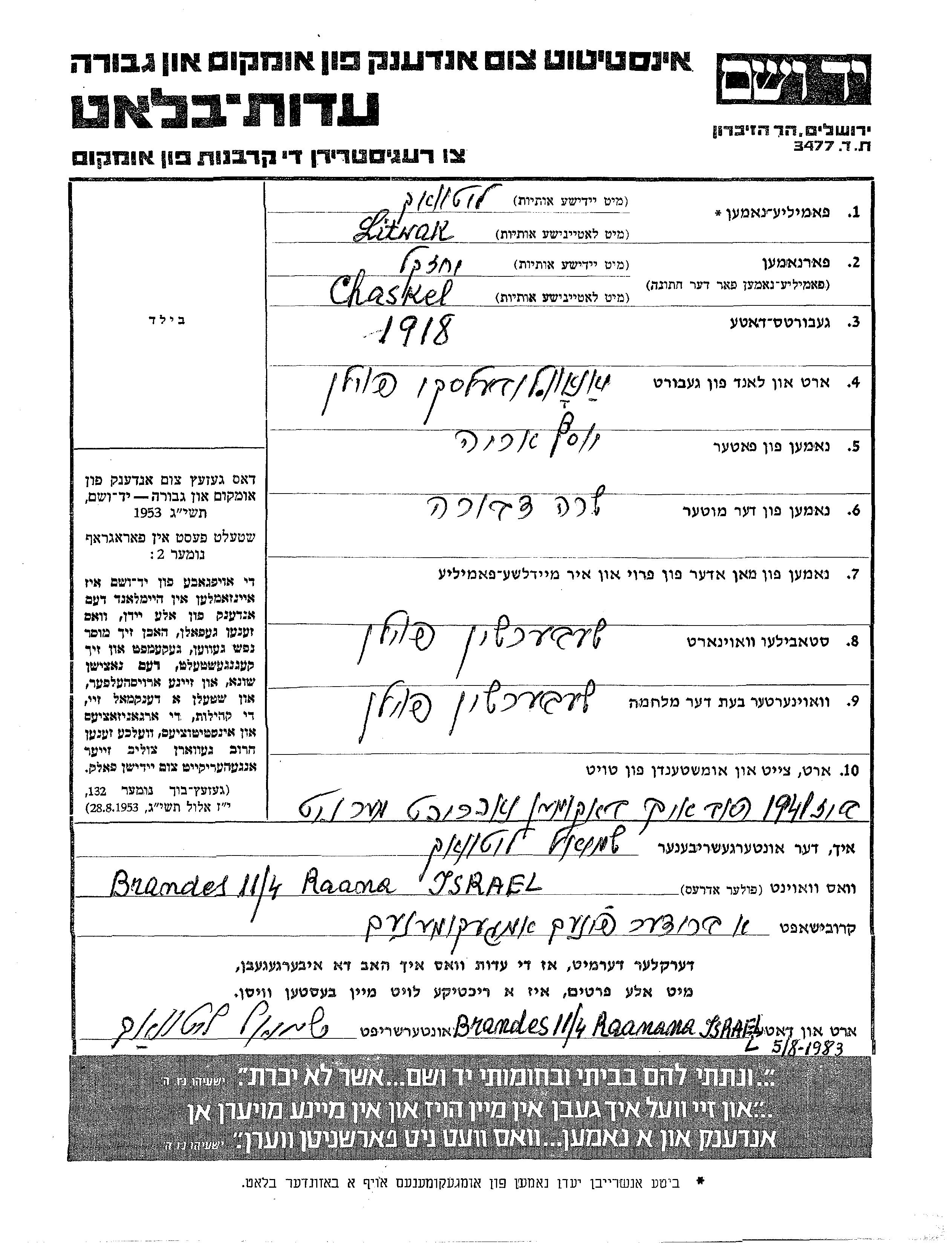 Litwak Chaskel 1918 Szczebrzeszyn, Pologne Feuille de témoignage