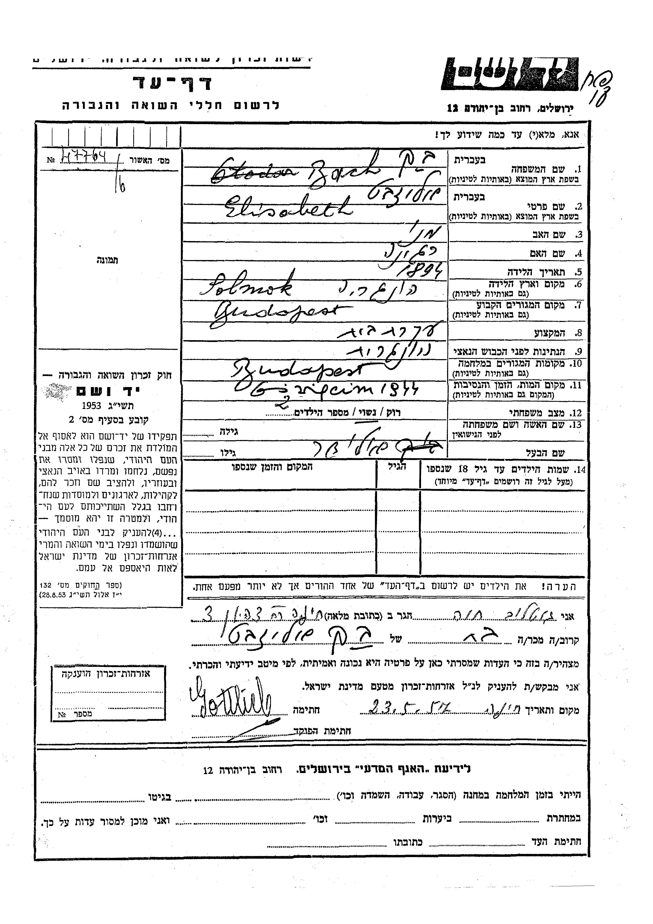 Bach Elisabeth 1894 Budapest, Hongrie Feuille de témoignage