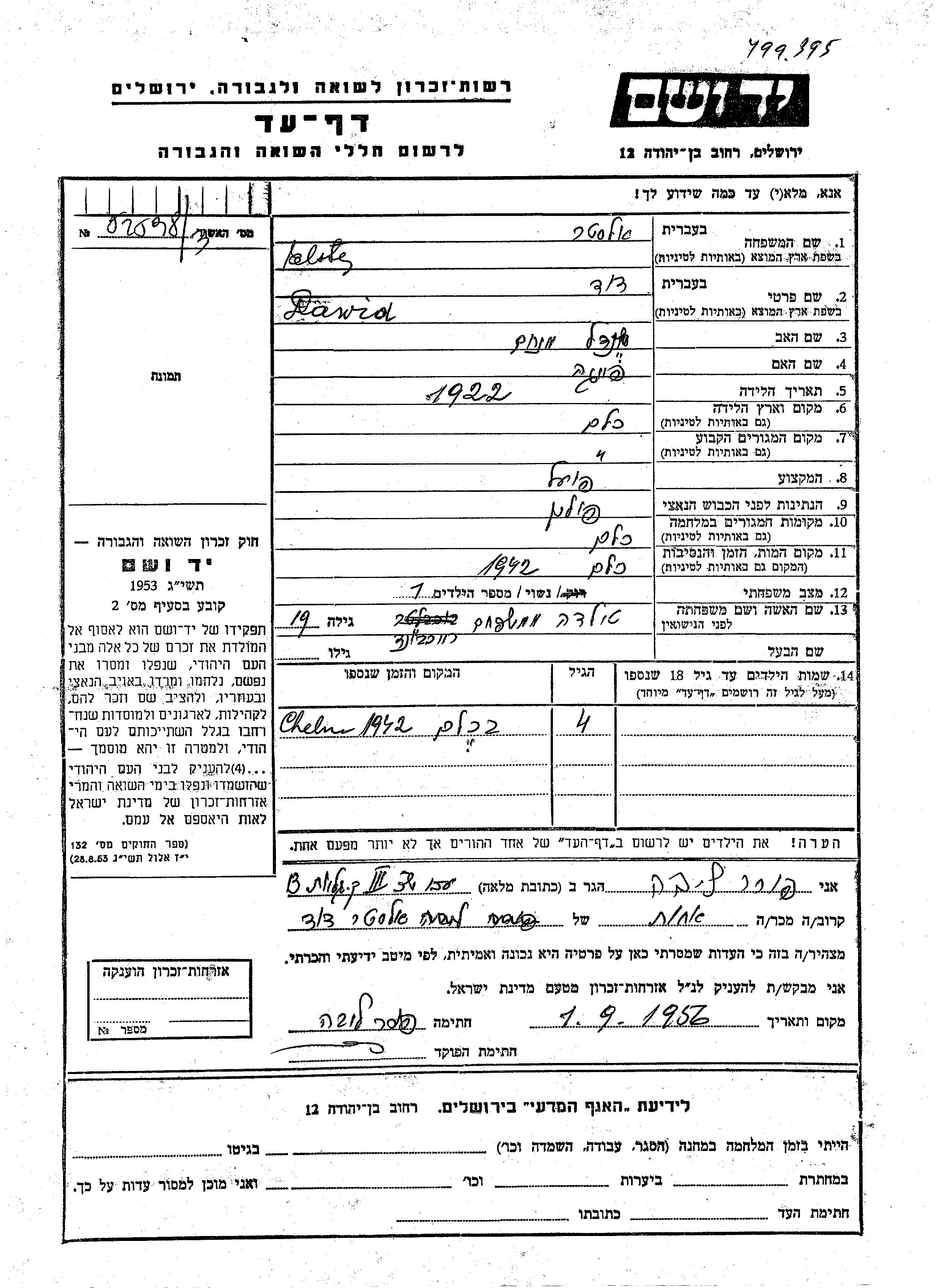 Dawid a été assassiné pendant la Shoah. Lieu de la mort: Chelm, Pologne en 1942.