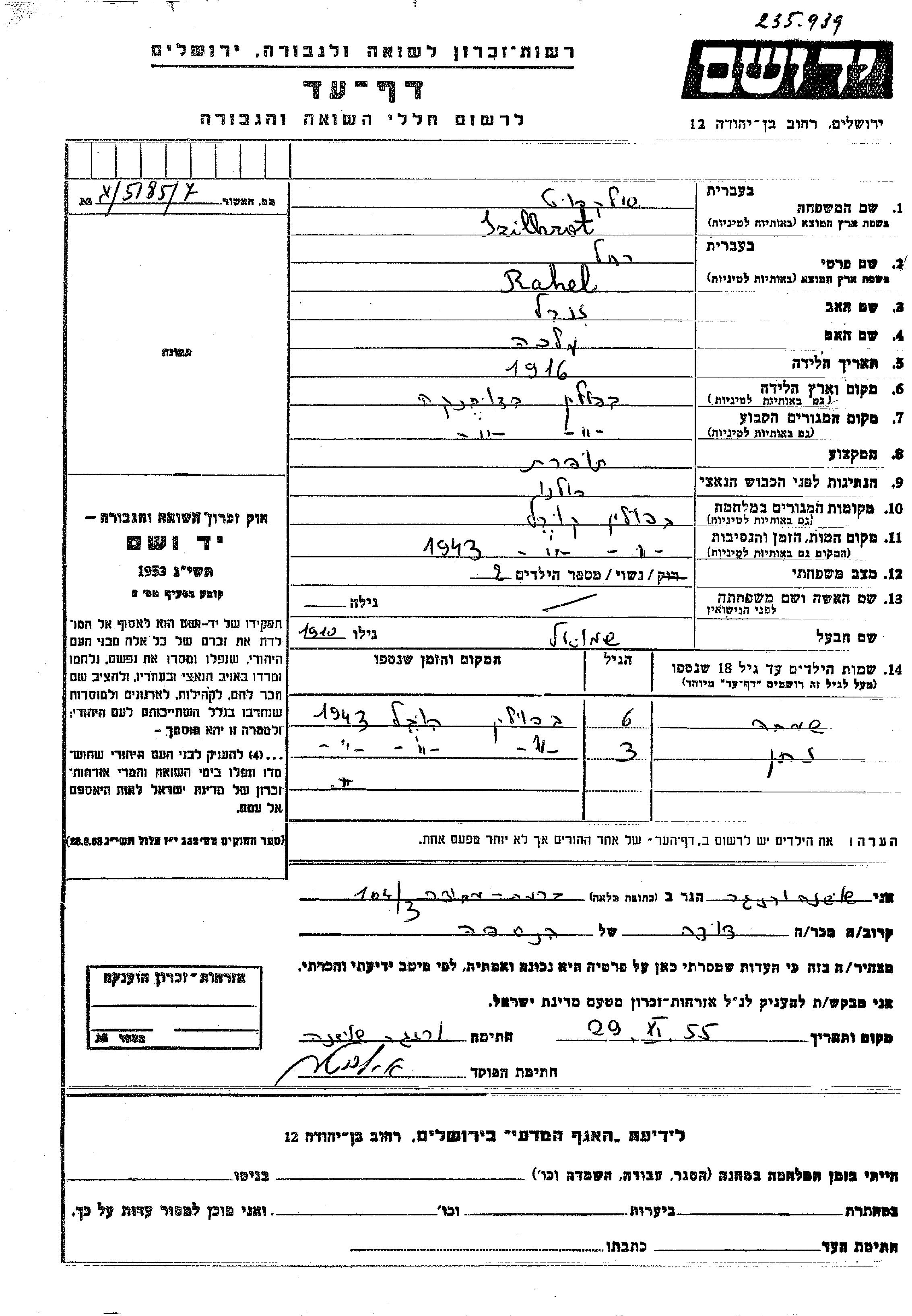 Szilkrot Rahel 1916 Dubenka, Pologne Feuille de témoignage