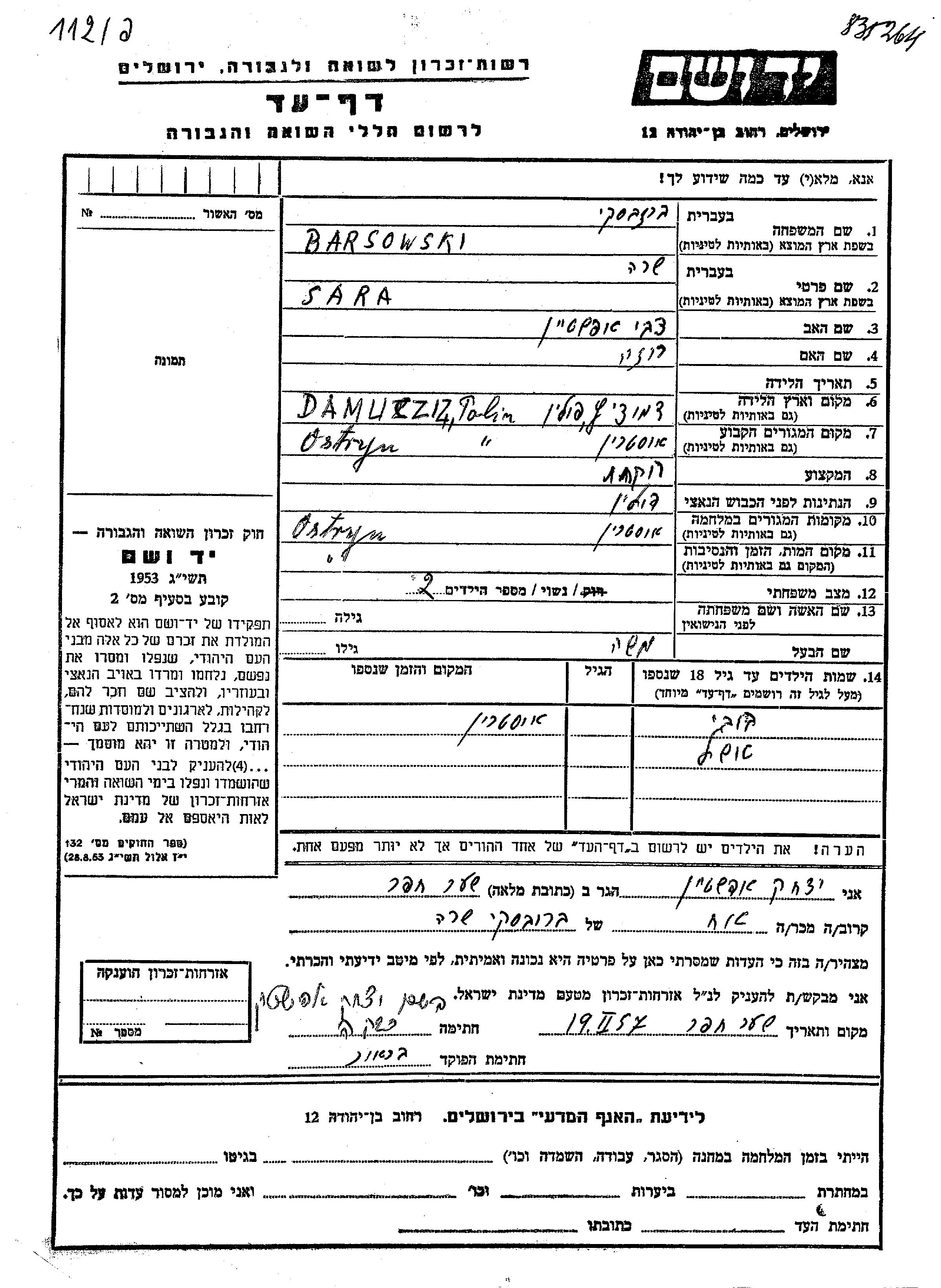 Barsowski Sara Ostryn, Pologne Feuille de témoignage