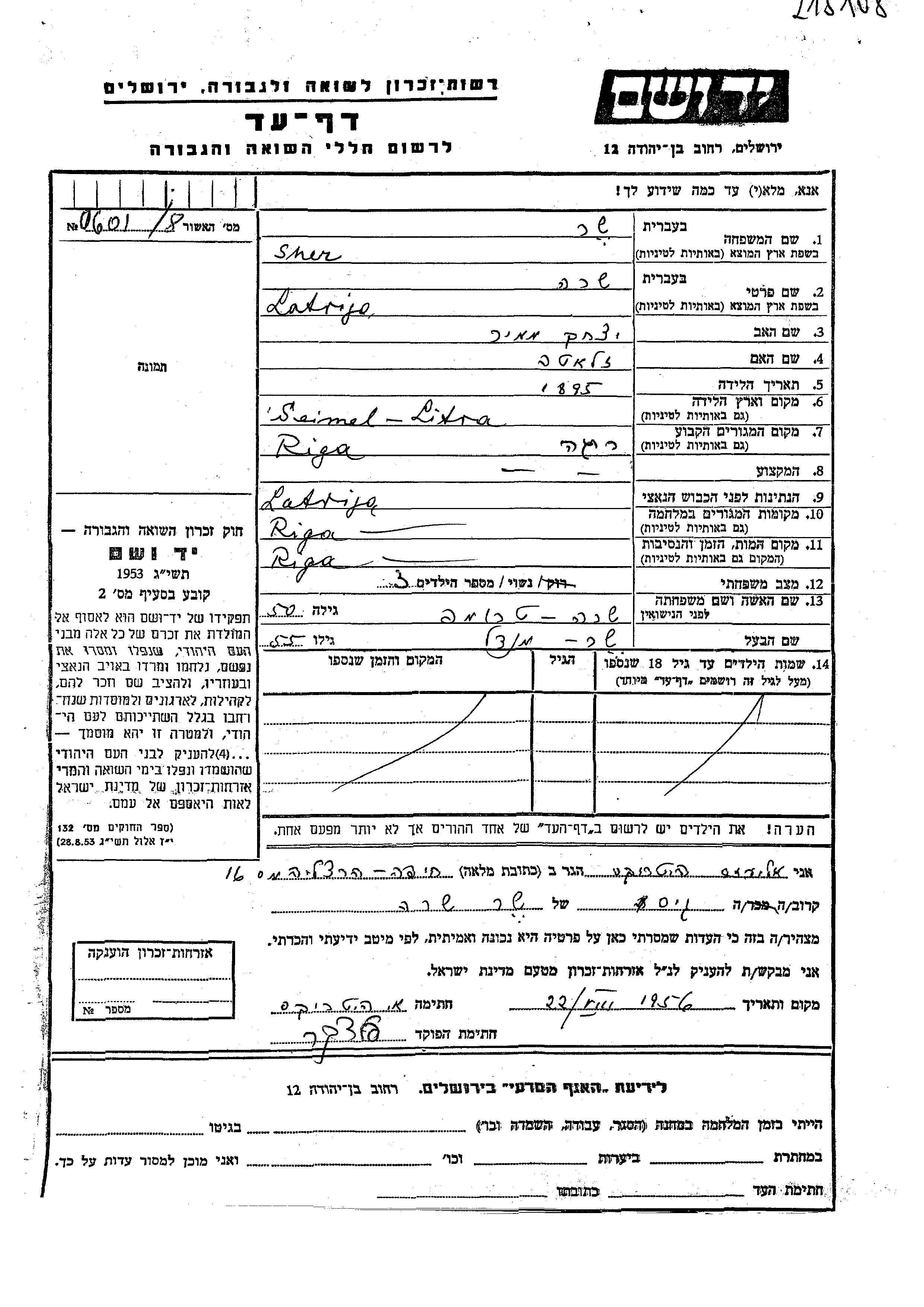 Sher Sara 1895 Riga, Lettonie Feuille de témoignage