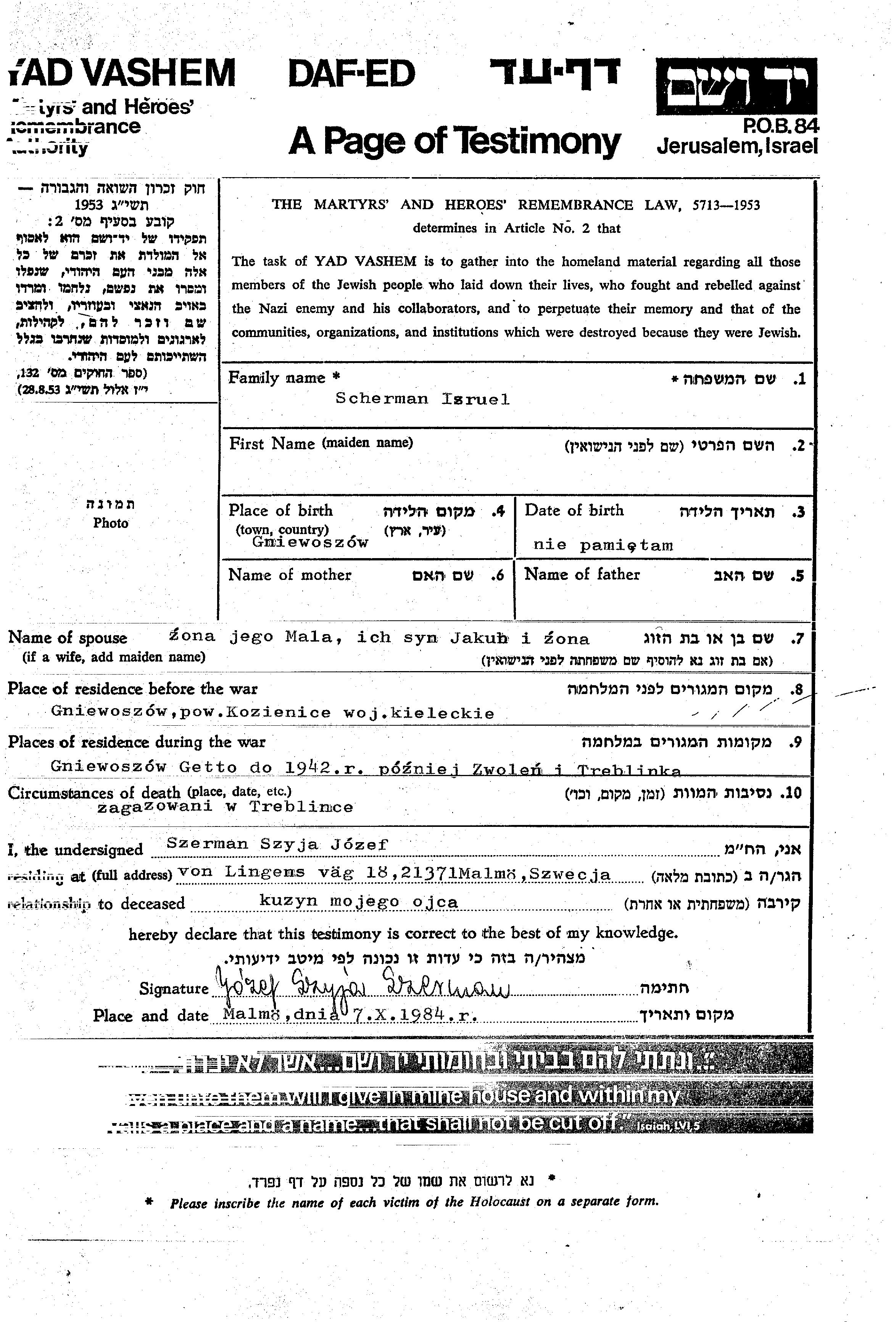 Scherman Isruel Gniewoszow, Pologne Feuille de témoignage