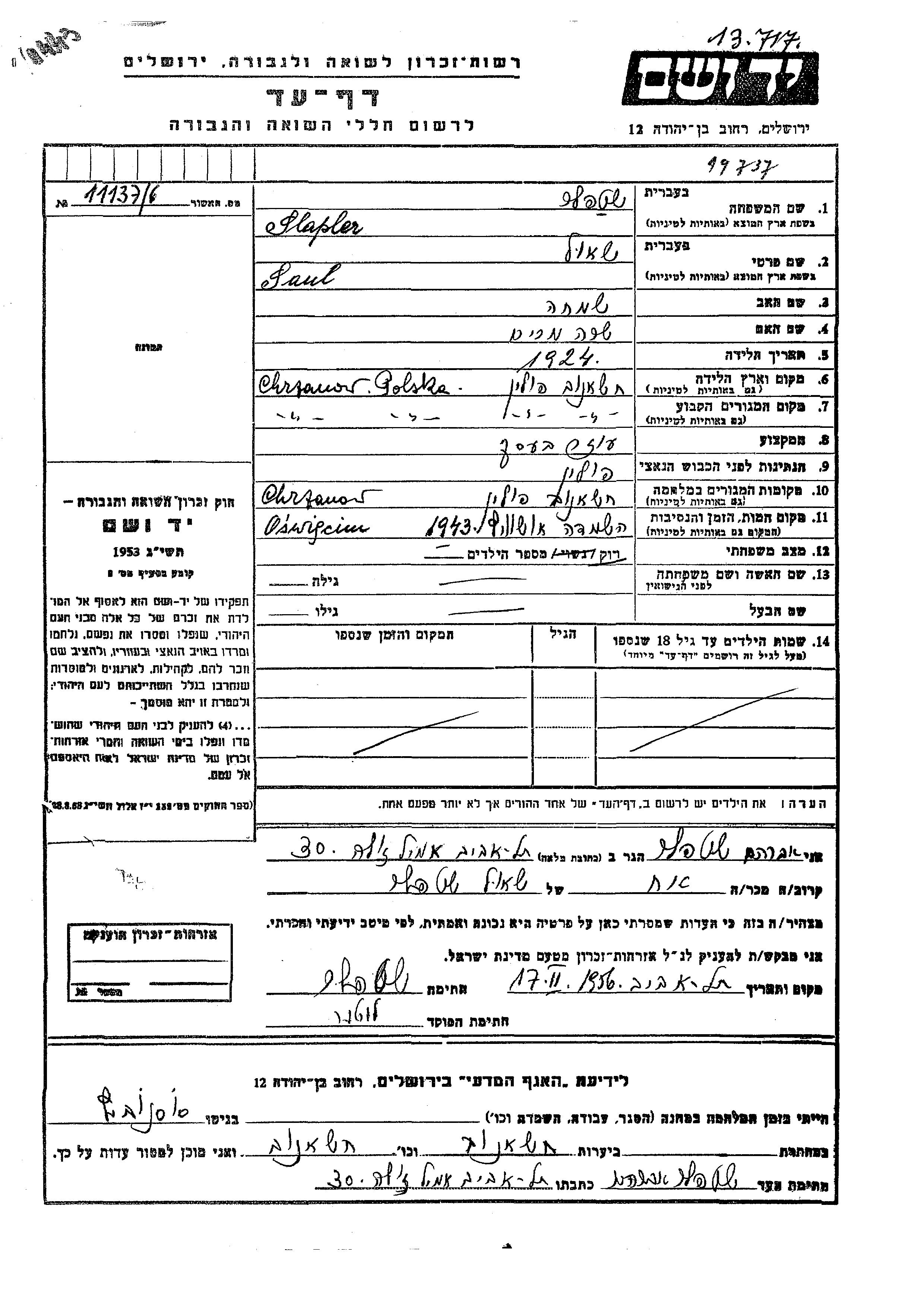 Stapler Shaul 1924 Chzanow, Pologne Feuille de témoignage