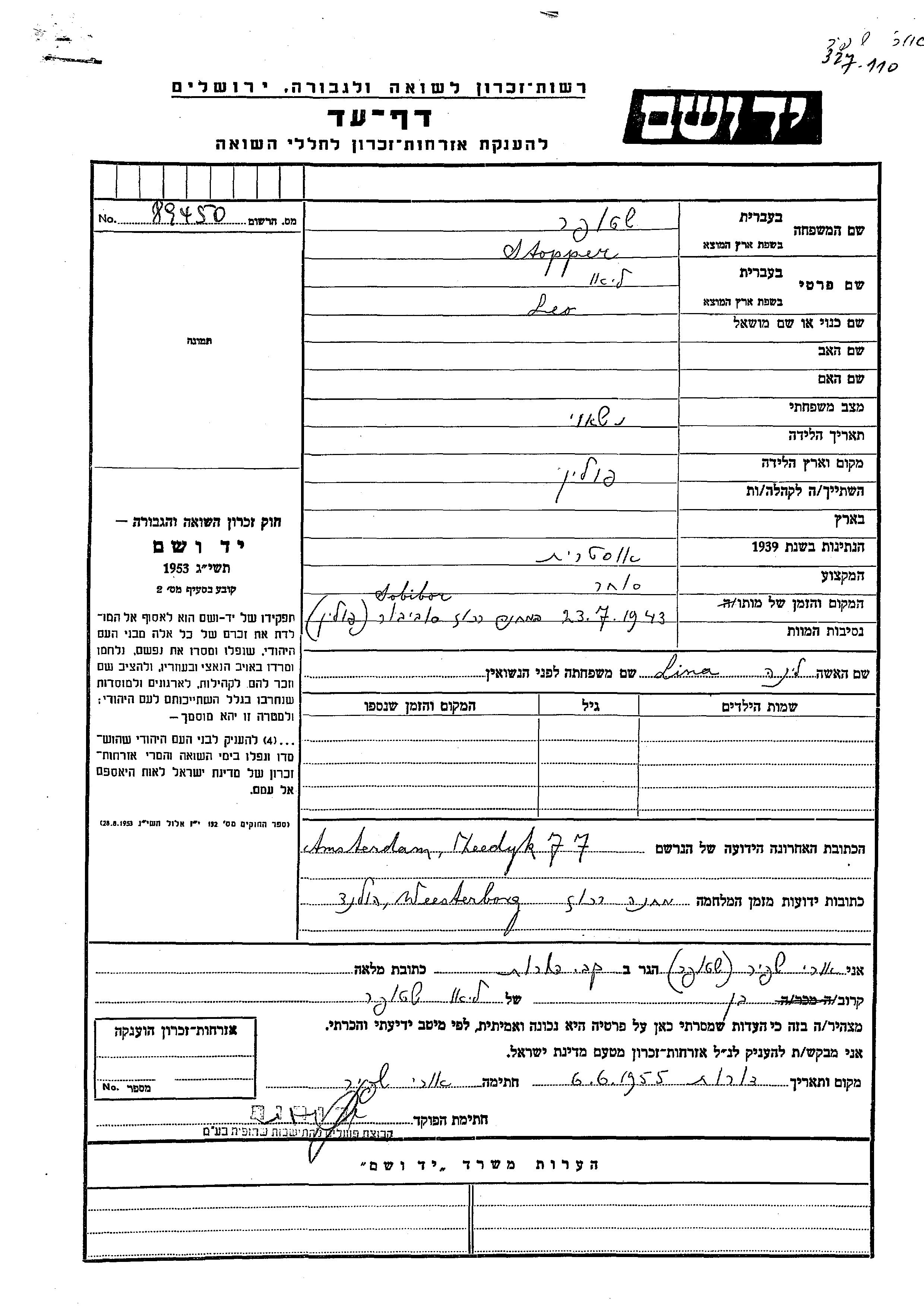 Leo Stopper est né à Pologne. Il était Commerçant/e et Mariée à Lina. Avant la seconde guerre mondiale il vivait à Amsterdam, Pays-Bas. Au cours de la guerre, il était à Westerbork, Pays Bas.
