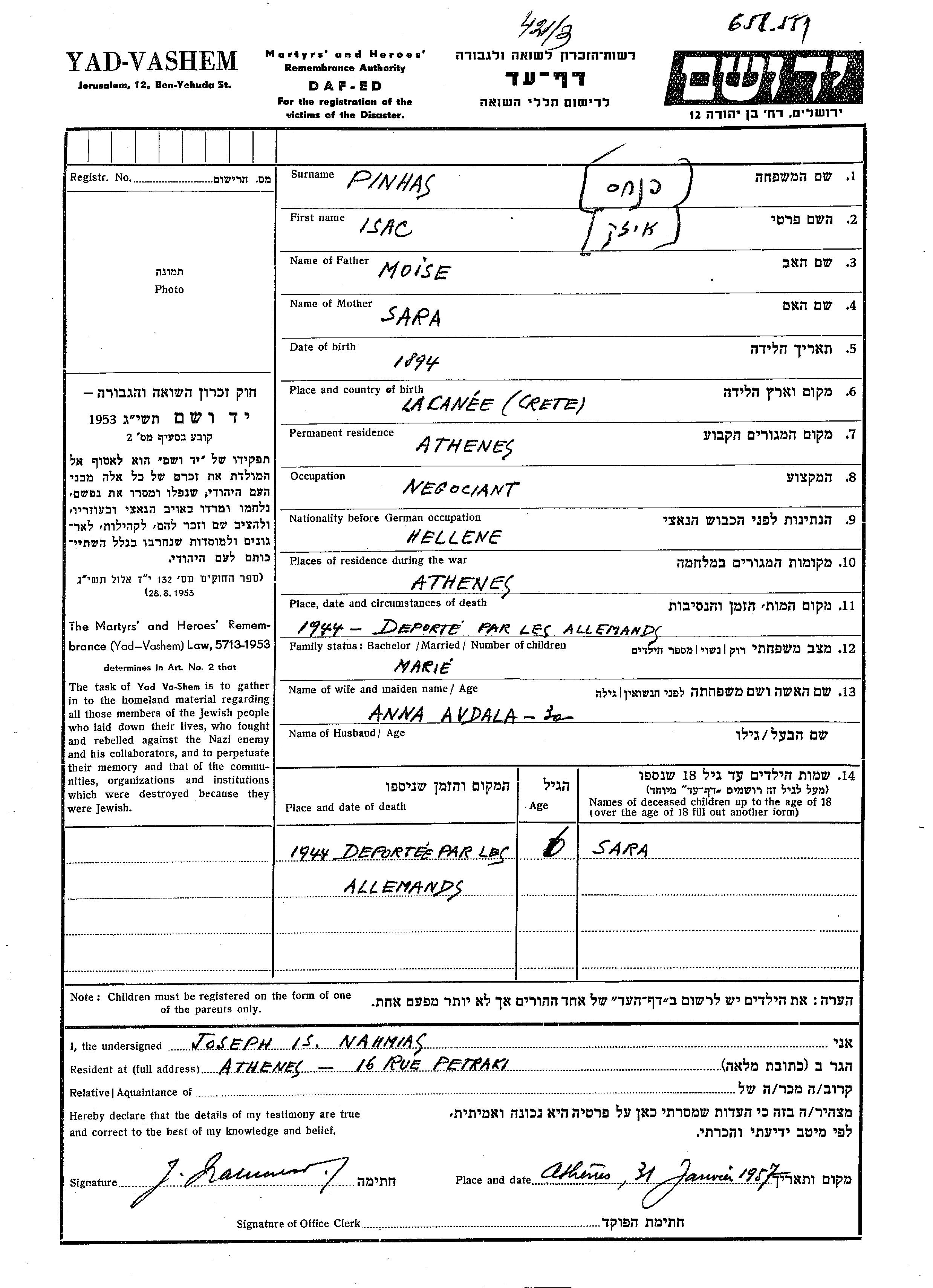 Isac Pinhas est né à Crete, Grèce en 1894, fils de Moise et de Sara. Il était Commerçant/e et Mariée à Anna née Avdala. Avant la seconde guerre mondiale il vivait à Athens, Grèce. Au cours de la guerre, il était à Athenai, Grèce.