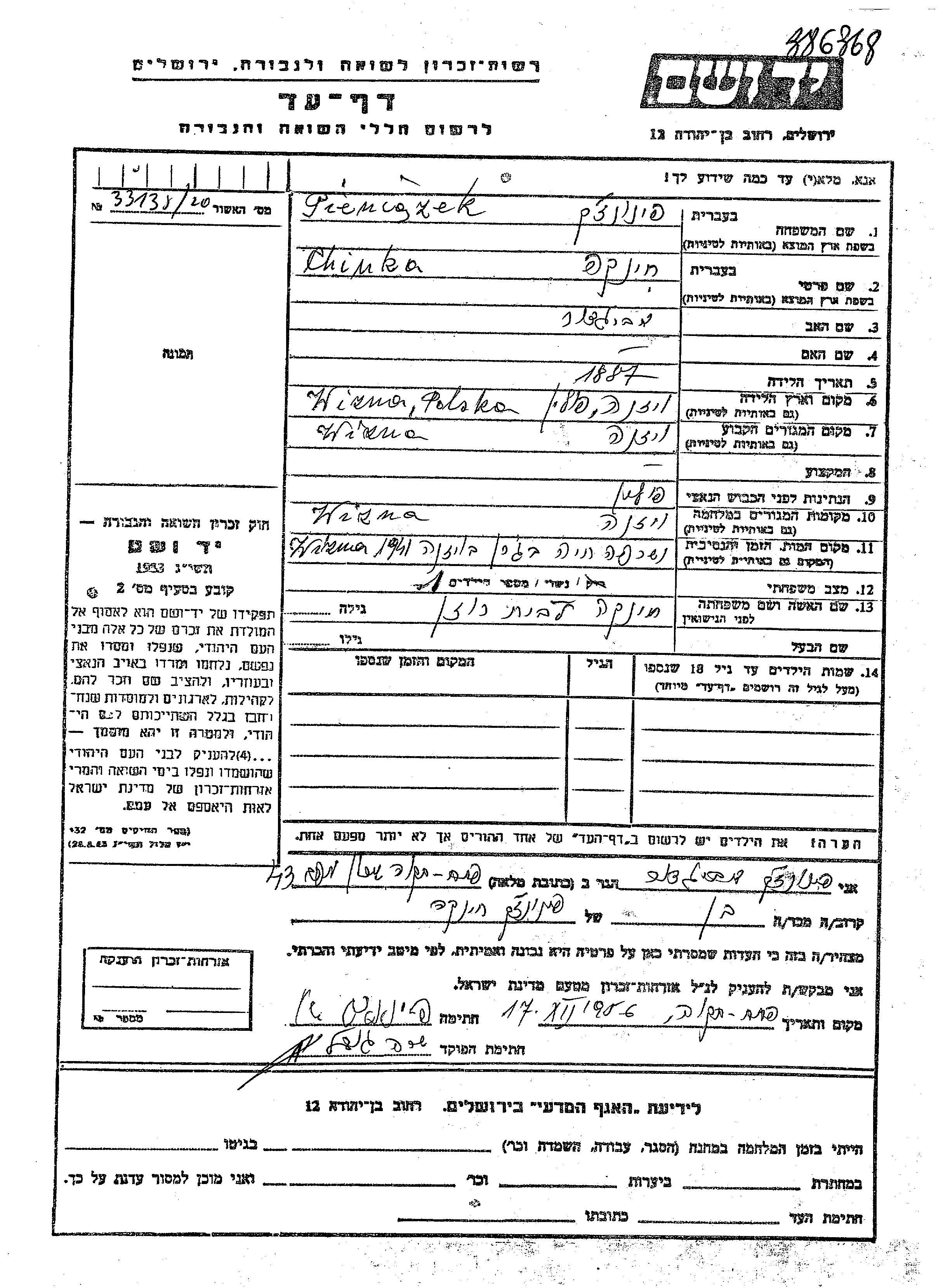 Chinka a été assassinée pendant la Shoah. Lieu de la mort: Wizna, Pologne en 1941.